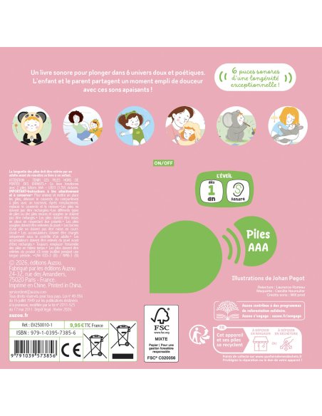 Ce livre propose 6 univers doux et poétiques ; à chaque univers, on retrouve 1 puce sonore qui diffuse un son apaisant :