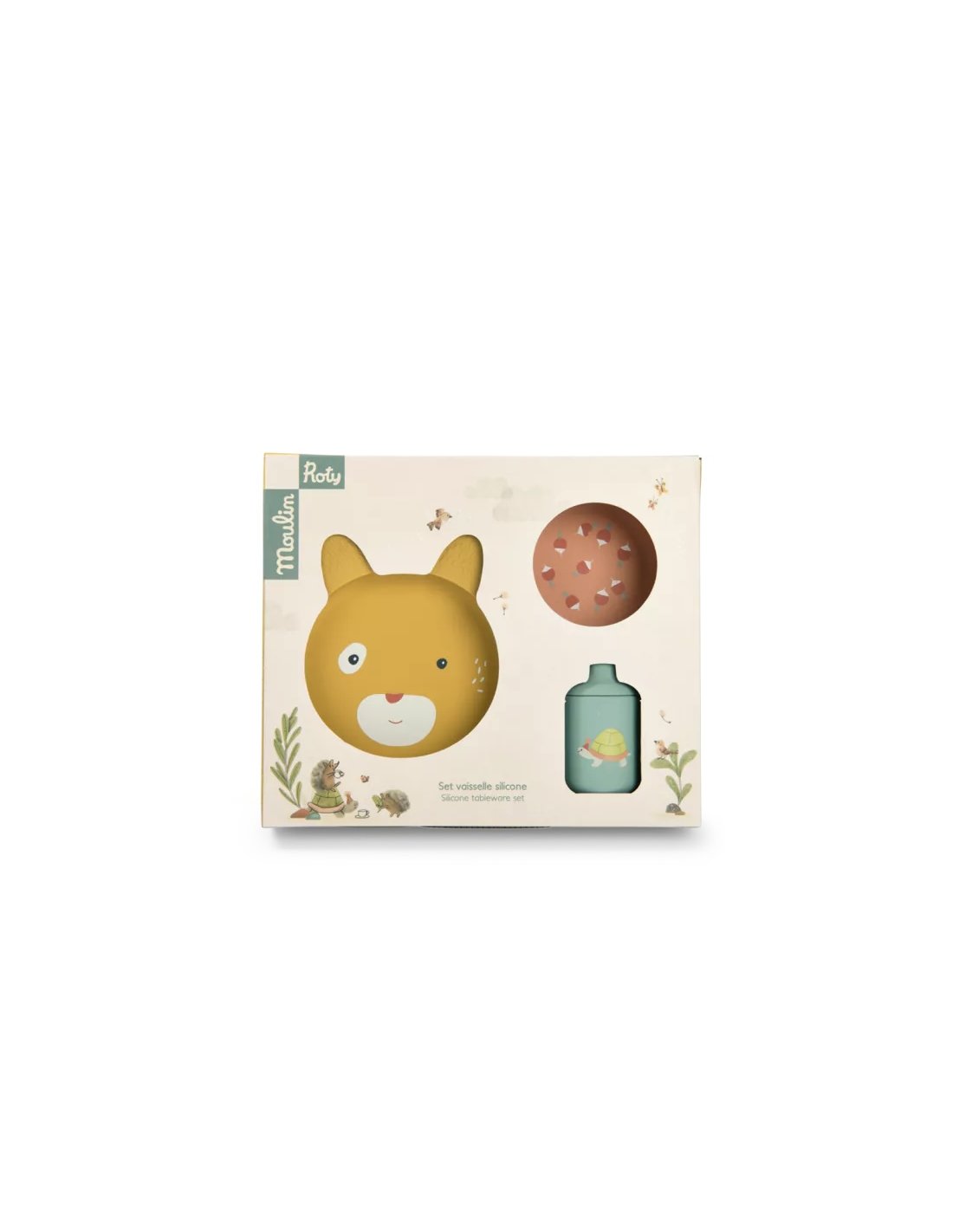 Manger comme les grands devient super facile avec le set vaisselle en silicone! Comprend un bol, une tasse à anses et une assiette illustrés aux couleurs des 3 petits lapins. Passe au lave-vaisselle et au micro-onde, et facile d'entretien.