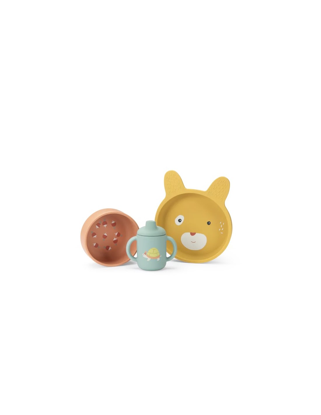 Manger comme les grands devient super facile avec le set vaisselle en silicone! Comprend un bol, une tasse à anses et une assiette illustrés aux couleurs des 3 petits lapins. Passe au lave-vaisselle et au micro-onde, et facile d'entretien.