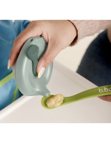 Sa forme ergonomique permet aux petites mains de le tenir et de le presser facilement, puis de le sucer intuitivement à l'aide de l'embout coudé, miam ! Vous pouvez également l'associer à une cuillère en silicone pour les premiers jours de l'alimentation dirigée par les parents.