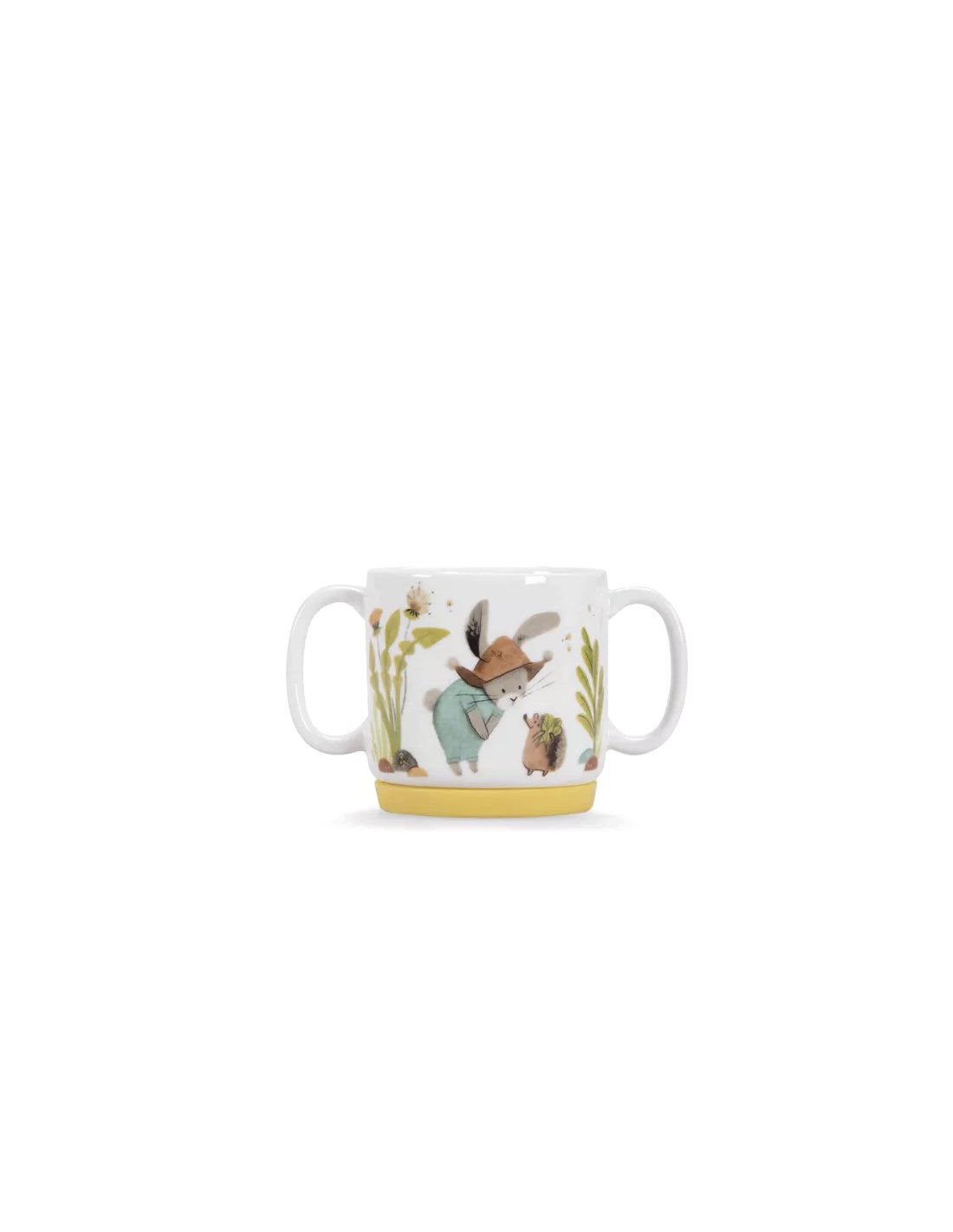Coffret vaisselle en porcelaine, tendrement illustré pour manger comme les grands. Comprend bol, tasse à anses et assiette avec chaussette antidérapante en silicone amovible qui adhère sur les surfaces lisses et empêche de glisser !