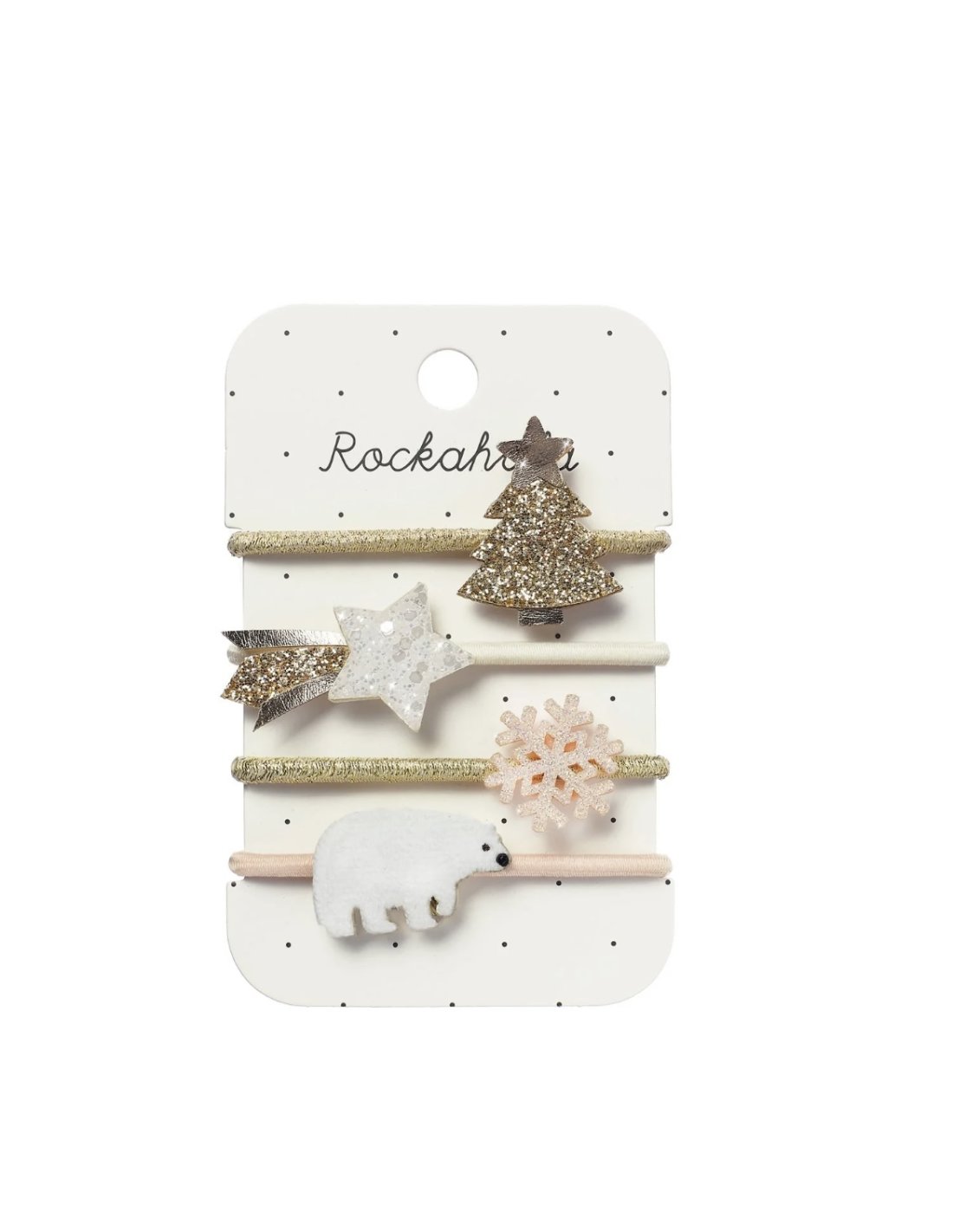 Bienvenue dans notre univers féérique enneigé, inspiré du pôle Nord ! Ce lot de quatre poneys comprend un sapin de Noël doré à paillettes, une étoile filante, un flocon de neige scintillant et un adorable ours polaire en velours. Tous sont suspendus à des élastiques dorés et neutres – la façon idéale de donner vie à la magie des rêves d'hiver ! Fabriqués à partir de feutrine recyclée, de paillettes, de polyuréthane et de velours.