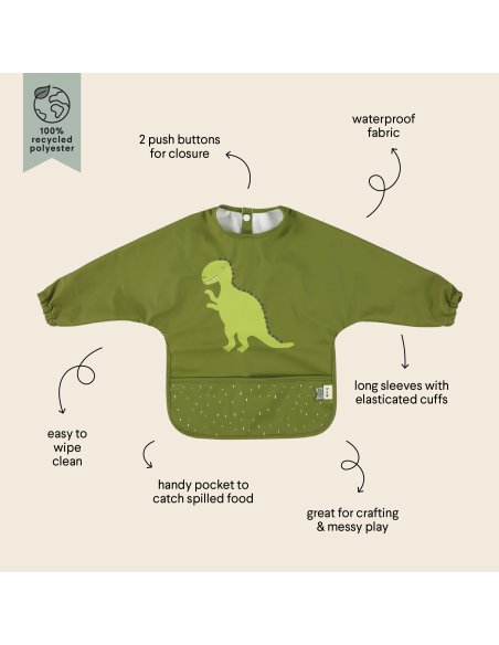 Amusez-vous et riez à table avec votre ami animal préféré ! Ce bavoir joyeux est doté de manches longues pratiques et garde les vêtements de votre bébé propres tout en savourant un bon repas, une boisson ou une collation. La poche pratique garantit que tous les aliments renversés sont soigneusement récupérés, ce qui réduit considérablement les dégâts. Autre bonne nouvelle : le tissu est imperméable et composé à 100 % de polyester recyclé ! Il est facile à nettoyer et vous fait gagner beaucoup de temps de lavage ou de nettoyage.