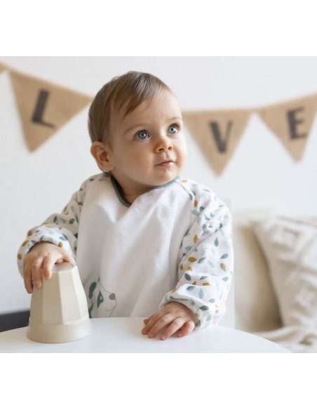 Ce bavoir tablier protègera les vêtements de bébé grâce à sa matière en éponge très absorbante et son dos plastifié. Ce bavoir imperméable se ferme à l'aide d'un velcros dans le dos et les manches ont un élastique aux poignets pour bien protéger les bras de bébé.