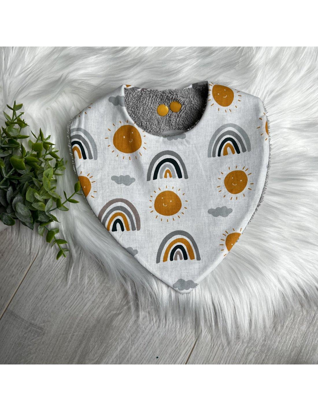 Bavoir bandana 100% coton avec une face popeline okéo-tex et une face éponge. Taille ajustable avec ses deux pressions. Convient de la taille naissance à 18 mois. Fait main avec amour.