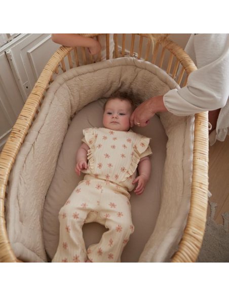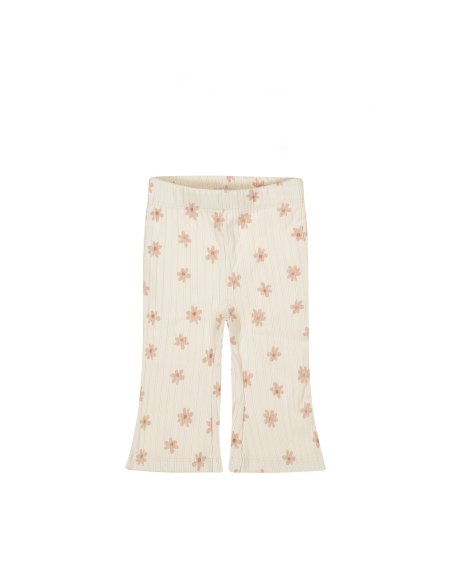 Legging évasé en coton côtelé avec de joli imprimé fleur rose sur fond écru.