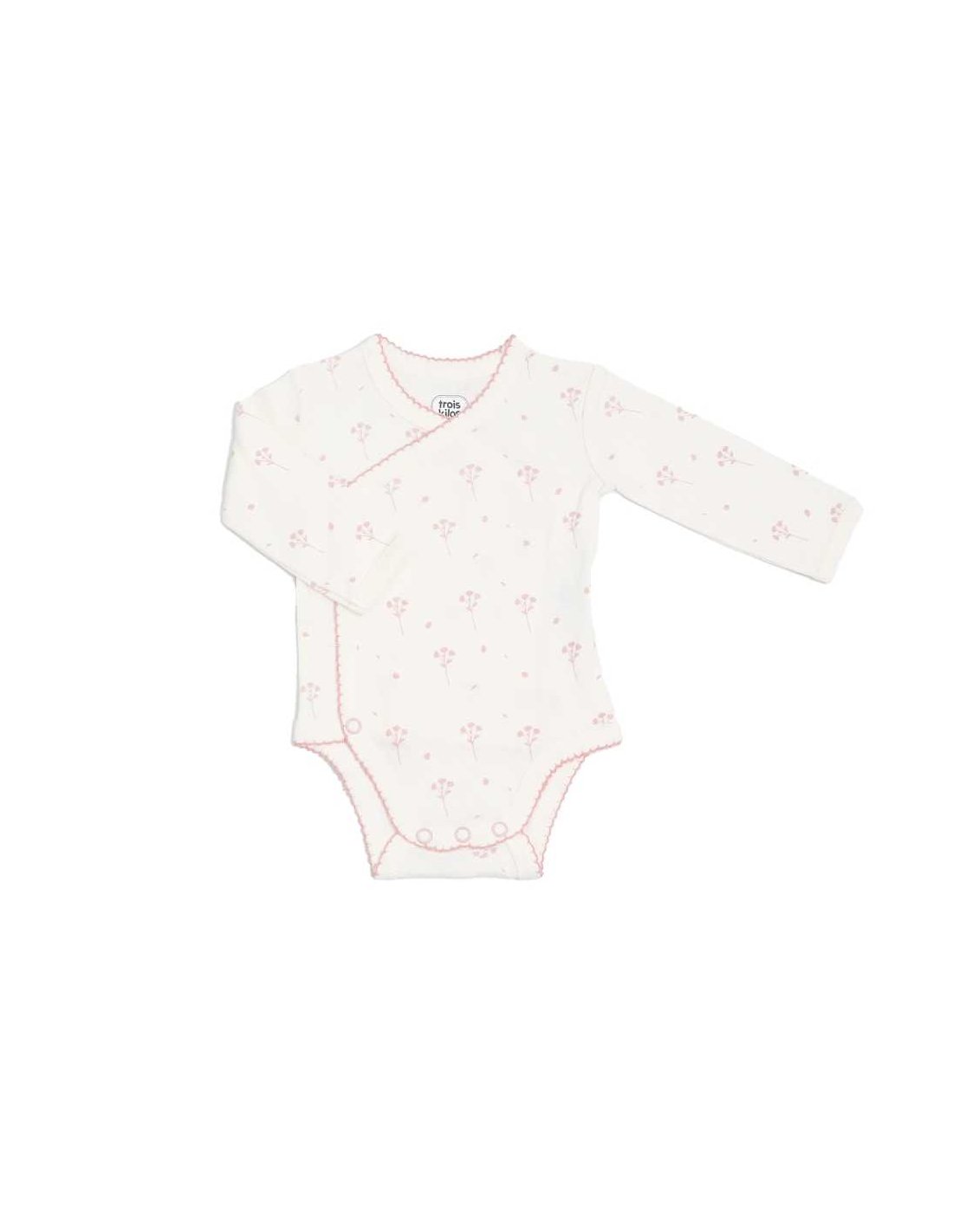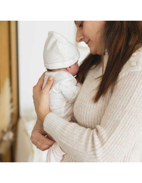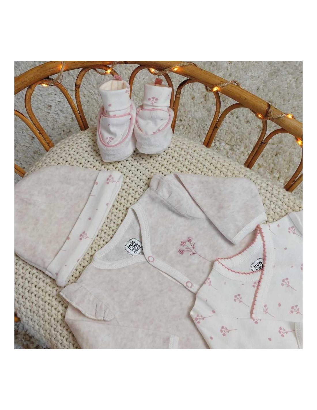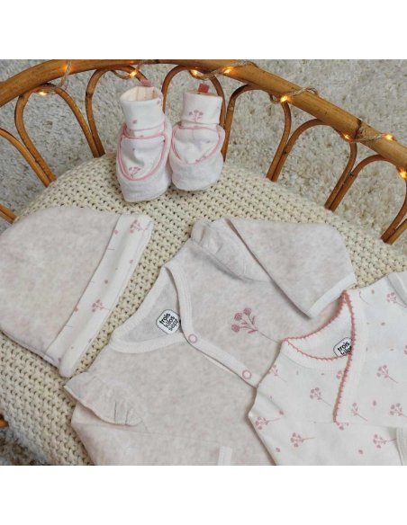 Vous trouverez dans ce joli kit naissance pour fille, un pyjama, un body, un bonnet, une paire de chaussons, des moufles délicates et un sac de rangement, tous ornés de motifs floraux adorables.