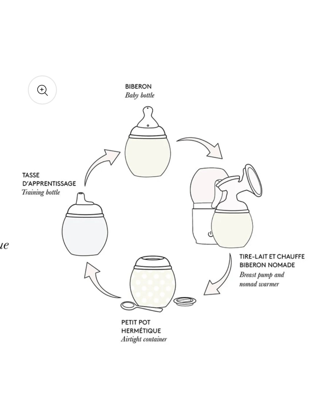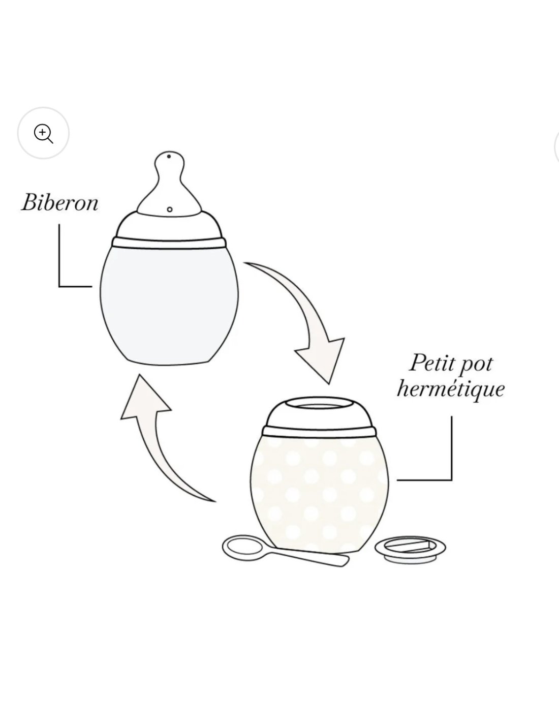 - Biberon évolutif qui se transforme en petit pot grâce à l'opercule fourni dans la boîte du biberon puis en tasse d'apprentissage avec les becs de succion (vendus séparément).