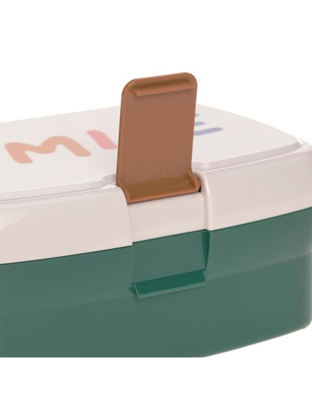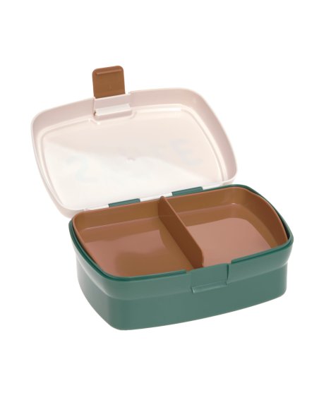 La boîte à goûter bicolore est équipée d'un compartiment amovible permettant de séparer les différentes collations.