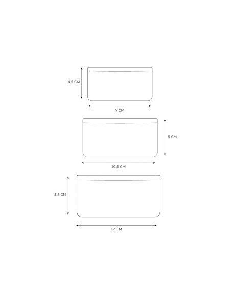 Taille L : 12 cm x 12 cm x 5,6 cm Taille moyenne : 10,5 cm x 10,5 cm x 5 cm Petit : 9 cm x 9 cm x 4,5 cm