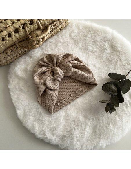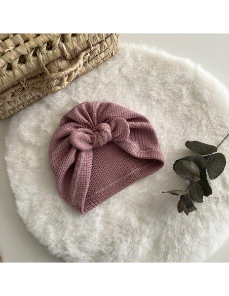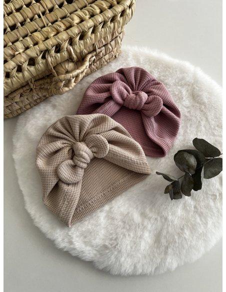 Bonnet turban en jersey gaufré. Disponible de la taille naissance à adulte. Coloris beige ou rose