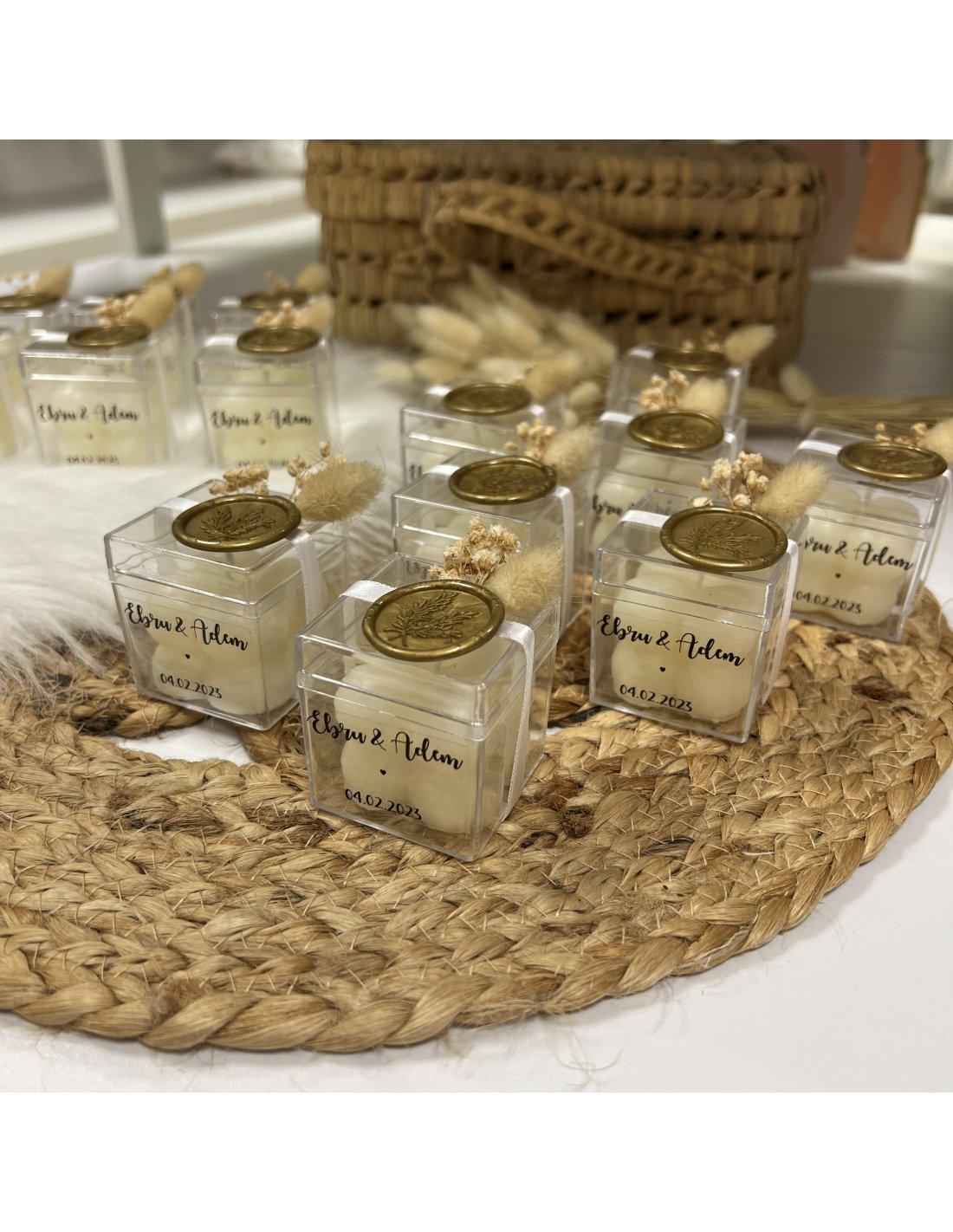 Boîte plexi personnalisée avec le texte et la date de votre choix. Bougie bubble. Le tout recouvert d'un ruban satiné et de fleurs séchées fixées avec de la cire de bougie.