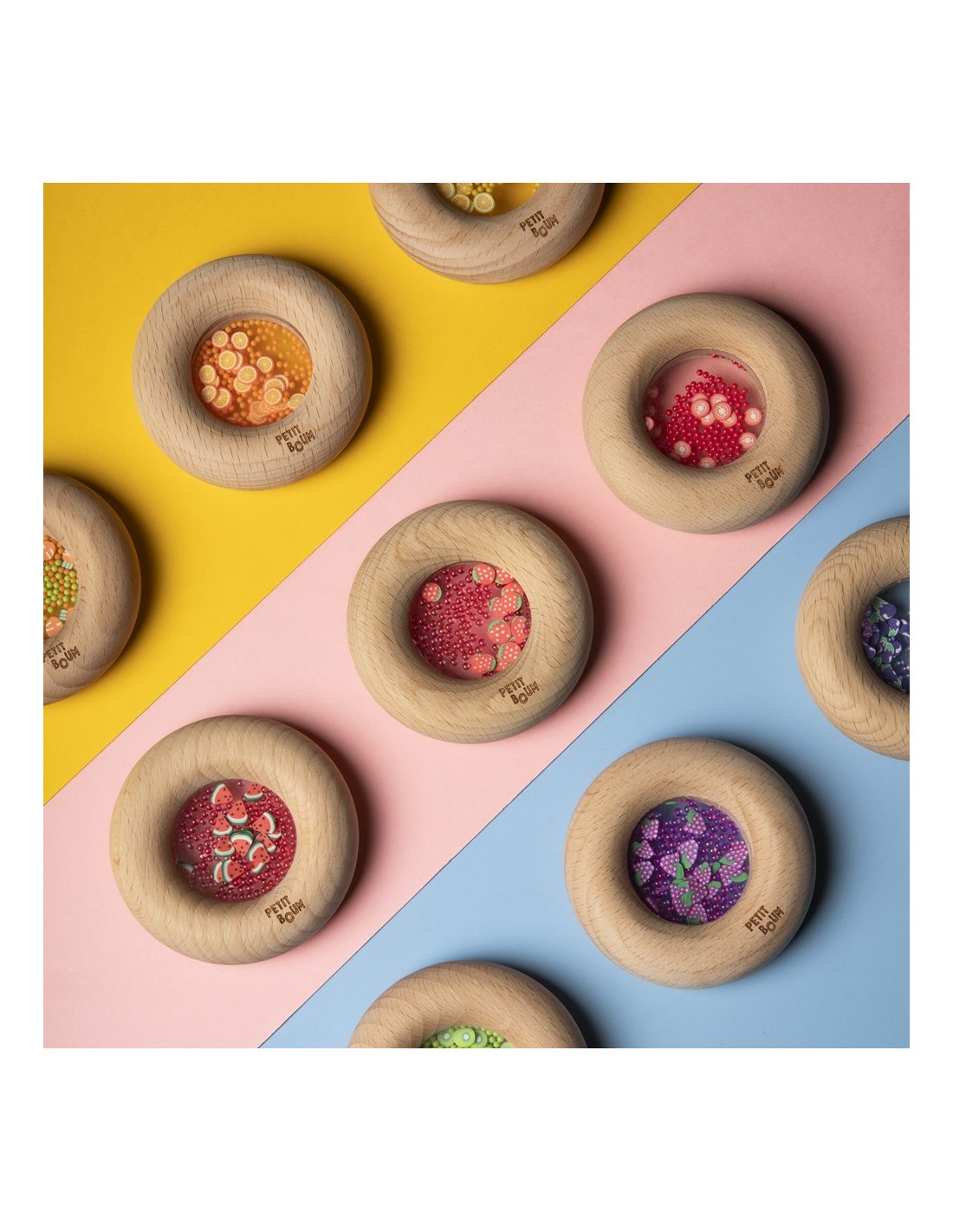 Nouveau jouet sensoriel qui ravira les plus petits. Il s'agit d'un hochet en bois en forme de donut, idéal pour que les petites mains puissent le manipuler confortablement. À l’intérieur, on distingue des figures de fruits et de légumes qui, lorsqu’ils sont secoués, libèrent l’irrésistible signature sonore de la maison. Même si vous avez envie de le manger, il est fabriqué en bois de hêtre naturel, non toxique et résistant aux morsures.