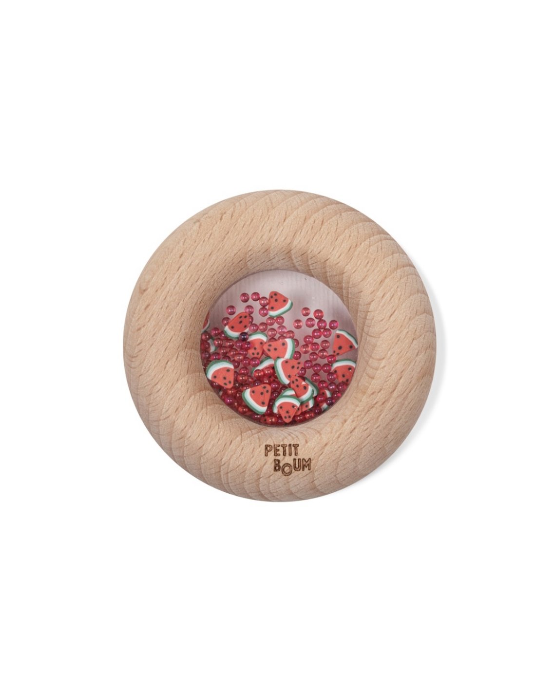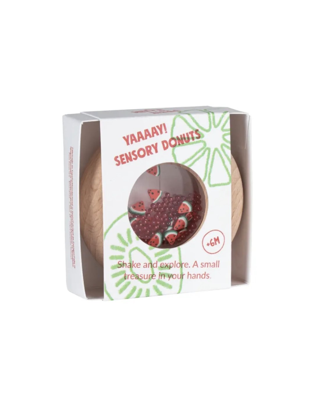 Nouveau jouet sensoriel qui ravira les plus petits. Il s'agit d'un hochet en bois en forme de donut, idéal pour que les petites mains puissent le manipuler confortablement. À l’intérieur, on distingue des figures de fruits et de légumes qui, lorsqu’ils sont secoués, libèrent l’irrésistible signature sonore de la maison. Même si vous avez envie de le manger, il est fabriqué en bois de hêtre naturel, non toxique et résistant aux morsures.