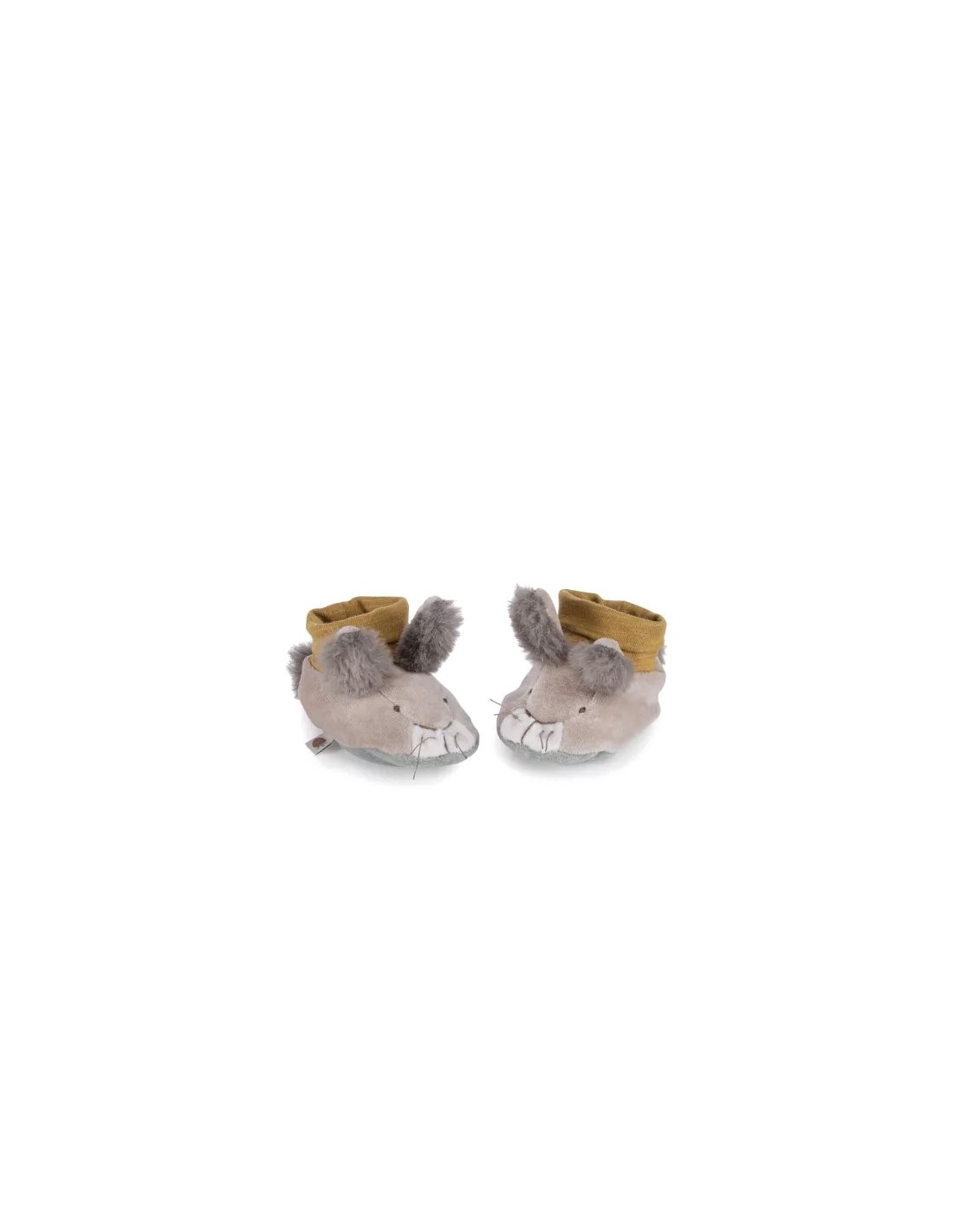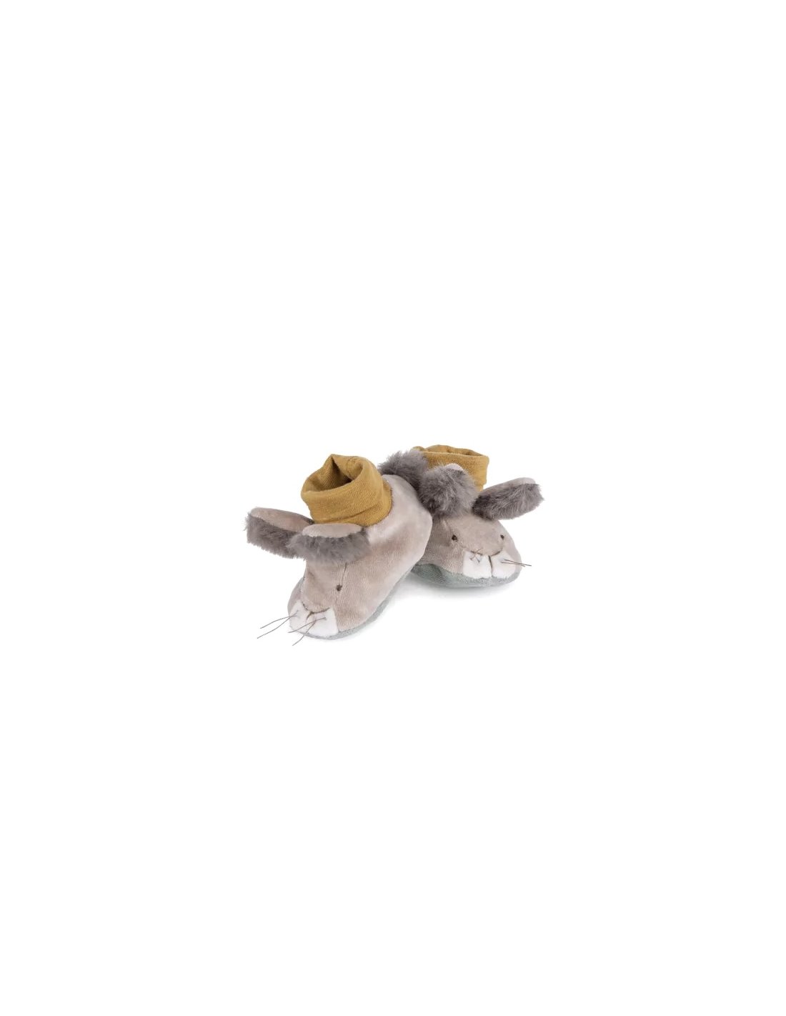 Petits chaussons lapin douillets. Avec leurs adorables frimousses à moustaches et leurs mélanges de matières douces (fourrure, velours éponge, jersey flammé), ils sont à croquer. Présentés dans une jolie boîte cadeau illustrée.