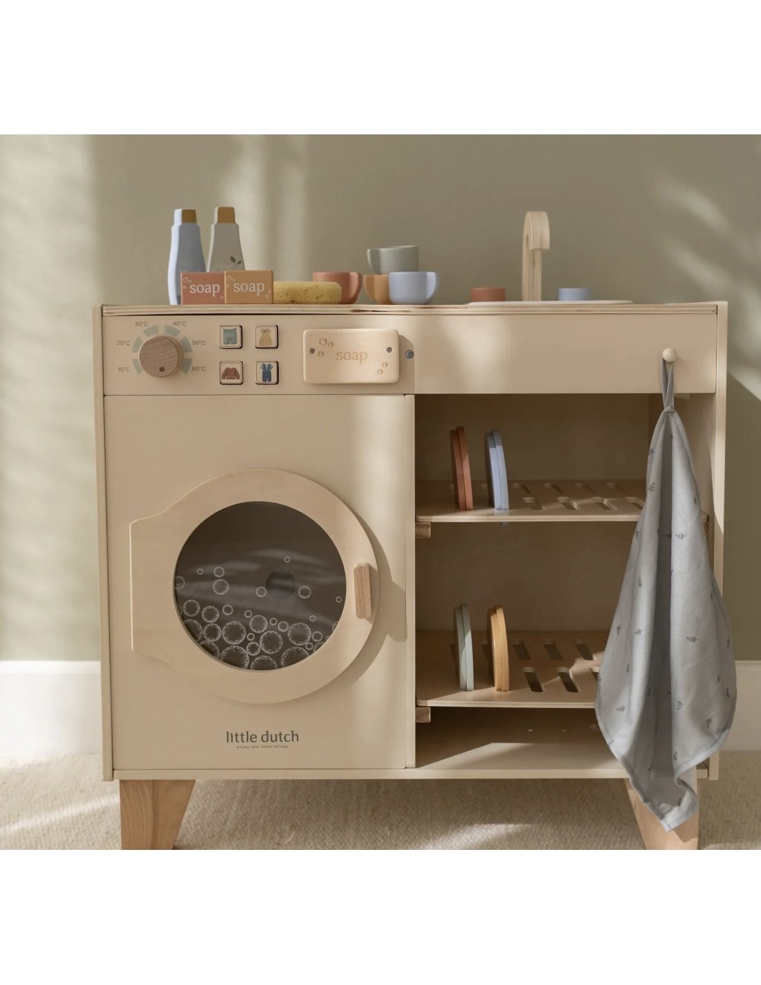 Avec cette machine à laver et lave-vaisselle en bois, les tâches ménagères deviennent une véritable aventure. Le set est complet avec quatre tasses, quatre soucoupes, deux assiettes, du détergent, des blocs de savon et un torchon. Lavez la vaisselle dans l'évier et donnez un coup de frais aux vêtements de poupée dans la machine à laver. Les boutons réalistes avec illustrations et le compartiment spécial pour le bloc de savon rendent le jeu encore plus amusant. Combinez la machine à laver et le lave-vaisselle avec la station de jeu de cuisine et le réfrigérateur pour créer un coin cuisine complet. Un plaisir de jeu sans fin pour les petits héros domestiques!