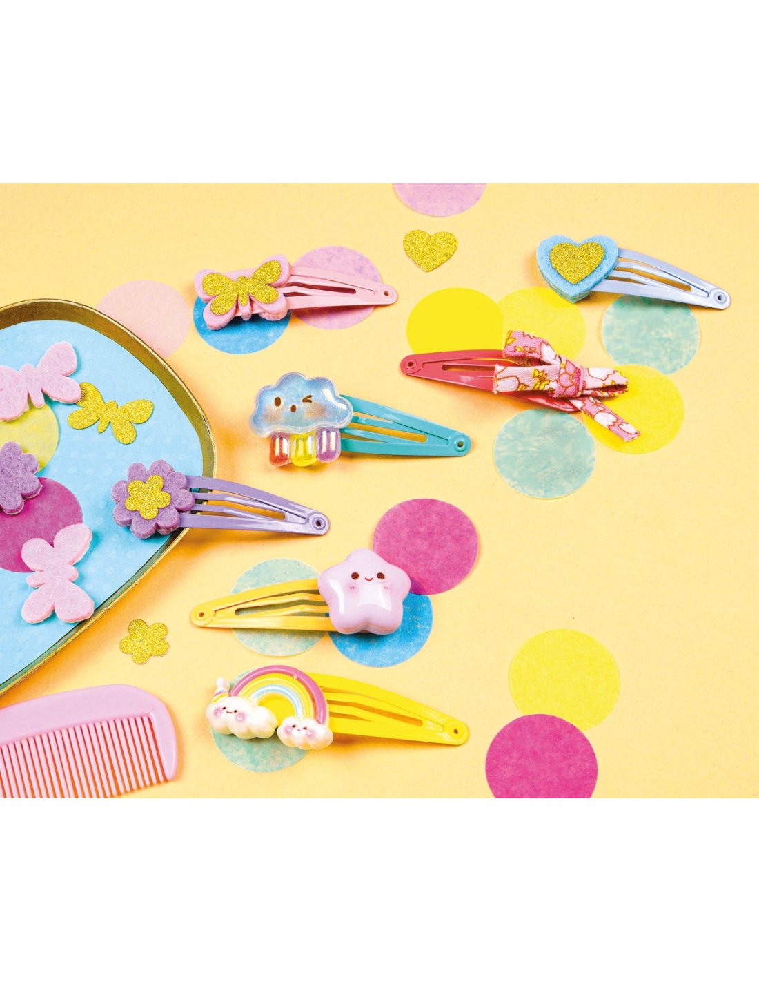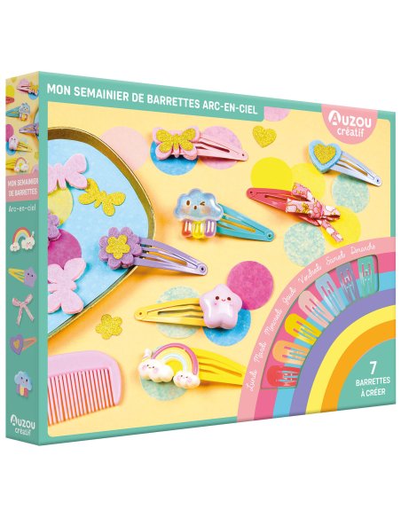 Le coffret contient 7 barrettes aux couleurs de l'arc-en-ciel, 3 gros charms kawaii, un ruban en Liberty et de la feutrine autocollante. Des autocollants dorés viennent compléter le tout pour concevoir et personnaliser 7 barrettes, pour chaque jour de la semaine !