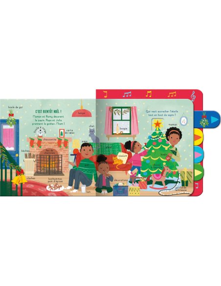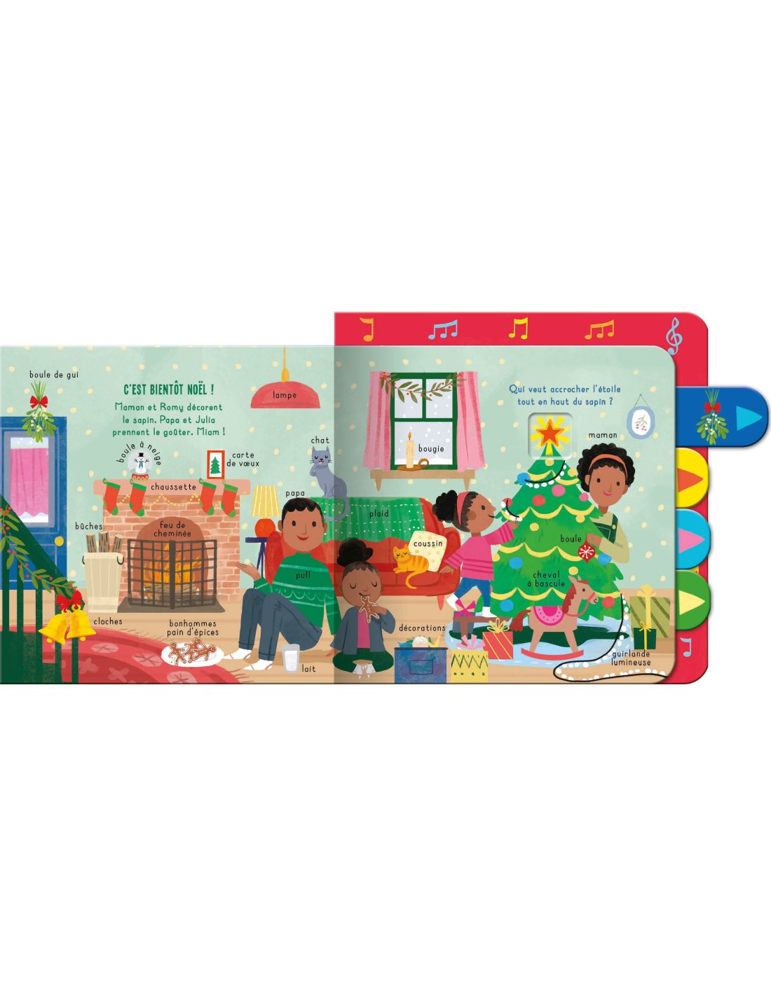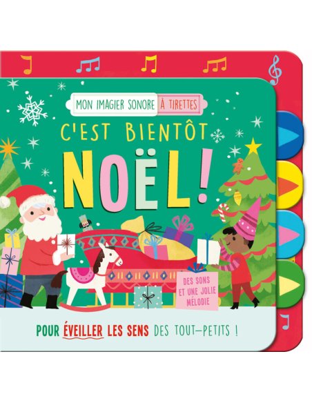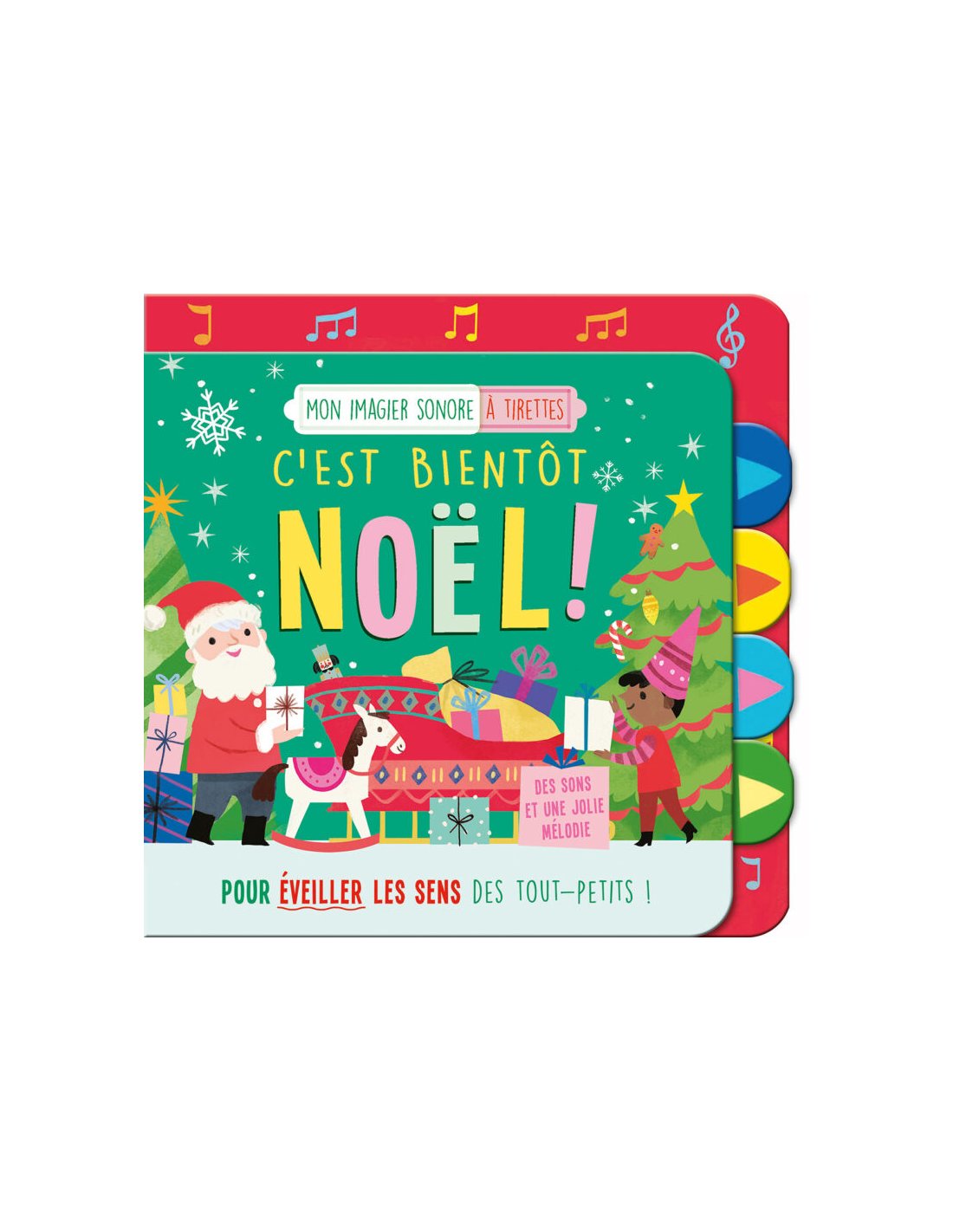 Cet imagier, avec des tirettes sonores à actionner, fait découvrir aux tout-petits la magie de Noël… En tout, plus de 100 mots. Sur chaque double-page, une question invite l’enfant à actionner une tirette pour entendre un son. Sur la dernière page, une puce sonore permet d’écouter une jolie mélodie. Un livre tout carton pour développer la dextérité des petites mains et éveiller la curiosité des jeunes enfants.