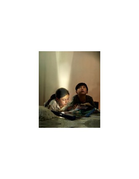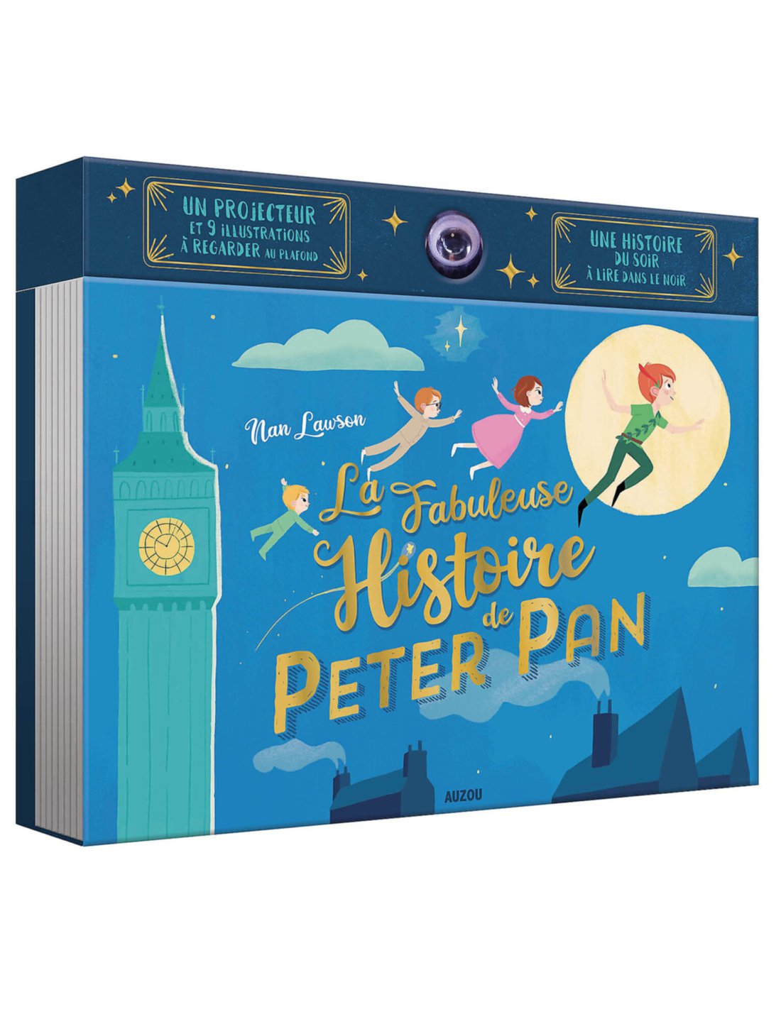 Ce livre tout-carton de 18 pages possède une lampe intégrée (pour lire l'histoire dans le noir complet) et un projecteur qui reproduit 9 illustrations originales de l'histoire de Peter Pan au plafond !