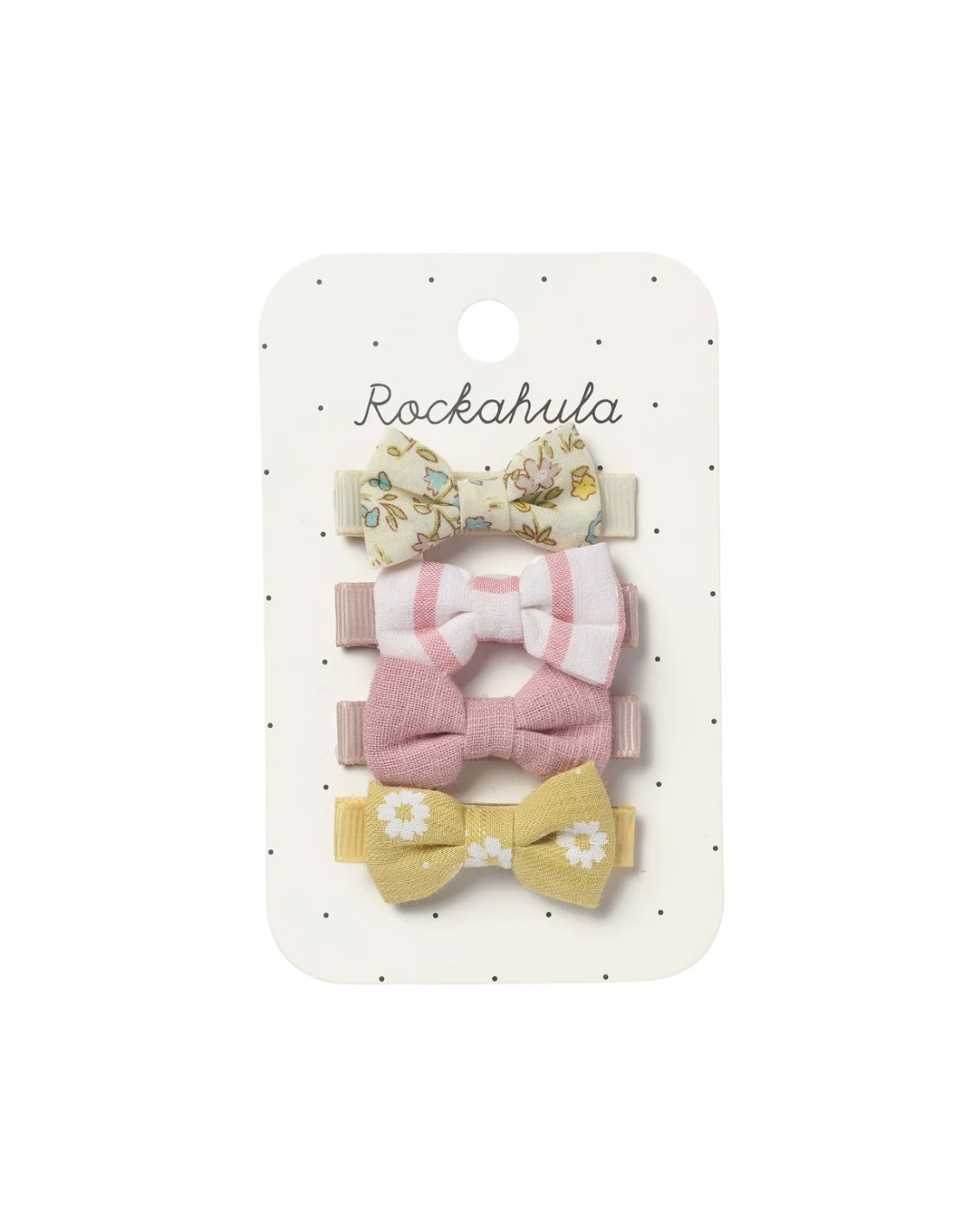 Cet ensemble de mini pinces à nœud est confectionné dans une palette de magnifiques couleurs pastel, comprenant notre tissu à pétales printaniers, notre adorable tissu à fleurs de marguerite, du rose tendre et des rayures roses et blanches. Chaque pince est recouverte d'un ruban gros-grain doux.