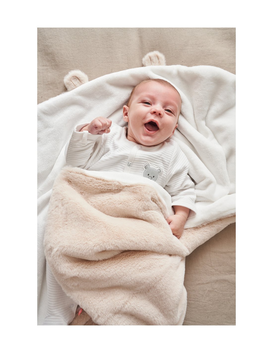 Confectionnée en Groloudoux® beige, une matière ultra douce au toucher peluche, elle enveloppe votre tout-petit de chaleur et de confort, idéale pour la mi-saison et l’hiver. Pratique et ingénieuse, sa taille idéale de 75*100cm en fait un accessoire polyvalent, parfait pour envelopper bébé dès sa naissance. La cadeau de naissance idéal !