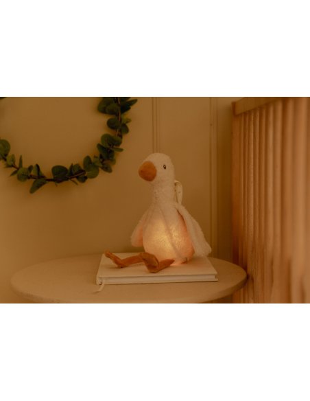 Un ami pour faire de beaux rêves. La Cuddle Goose Light & Sound offre amour, confort et sécurité grâce à sa douce lueur et à ses sons apaisants, tels qu'une douce mélodie, les battements du cœur et les bruits de l'utérus. Cette adorable petite oie aide votre bébé à se détendre et à s'endormir. Elle est fabriquée dans un tissu doux et câlin. Un compagnon réconfortant de jour comme de nuit. Cette petite oie peut faire 8 couleurs différentes grâce à son boîtier qui s'insère dans la peluche. Le boîtier se recharge avec un cable USB-C qui est fourni avec la peluche.