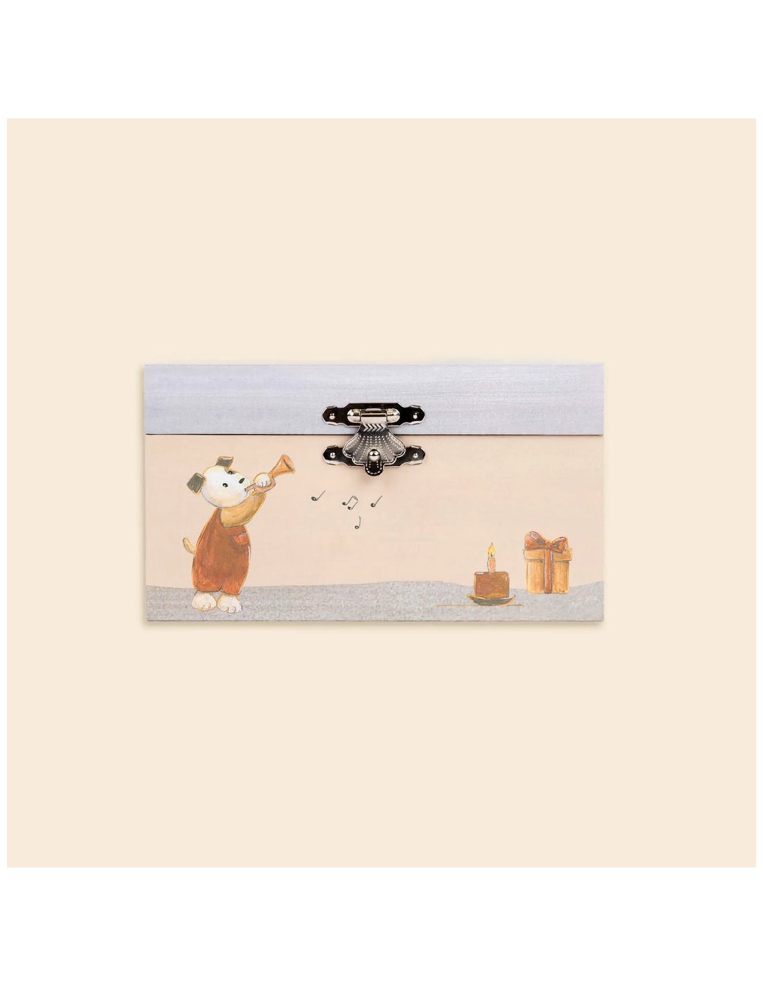 Un petit chiot joue de sa trompette dorée tandis que des trésors attendent en sécurité à l'intérieur. Des murs en bois lisse gardent les objets précieux bien à portée de main.