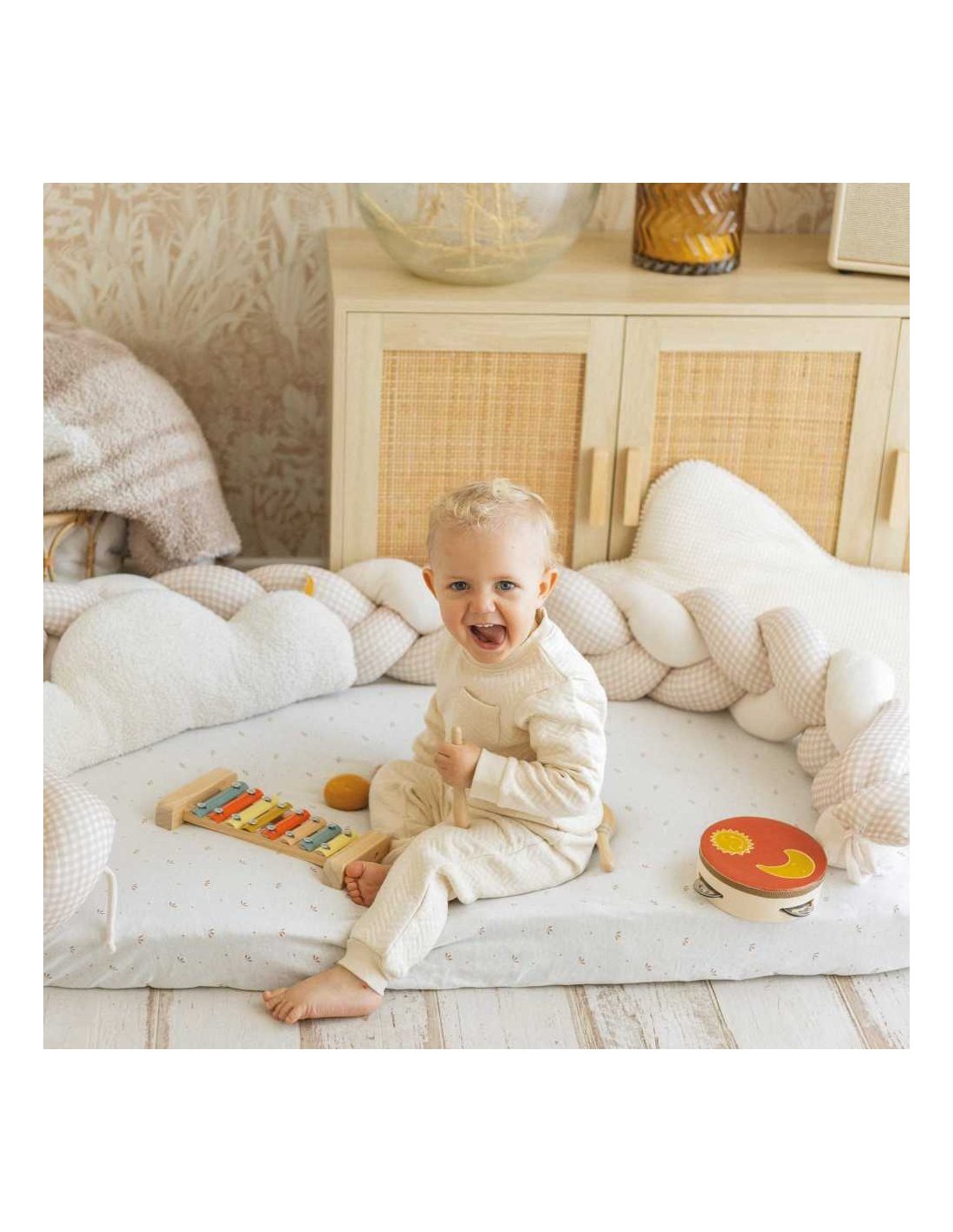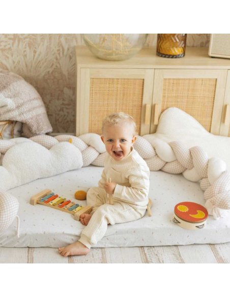 Cette tresse décorative bébé de 2 mètres est pensée pour créer un espace de jeu sécurisé et délimité, tout en ajoutant une touche déco à l’univers de bébé. Placée autour d’un tapis d’éveil, au fond d’un parc, ou dans un coin lecture, elle offre une barrière douce pour protéger bébé lors de ses premières explorations. Elle aide à absorber les petits chocs liés aux roulades ou aux chutes légères du quotidien.