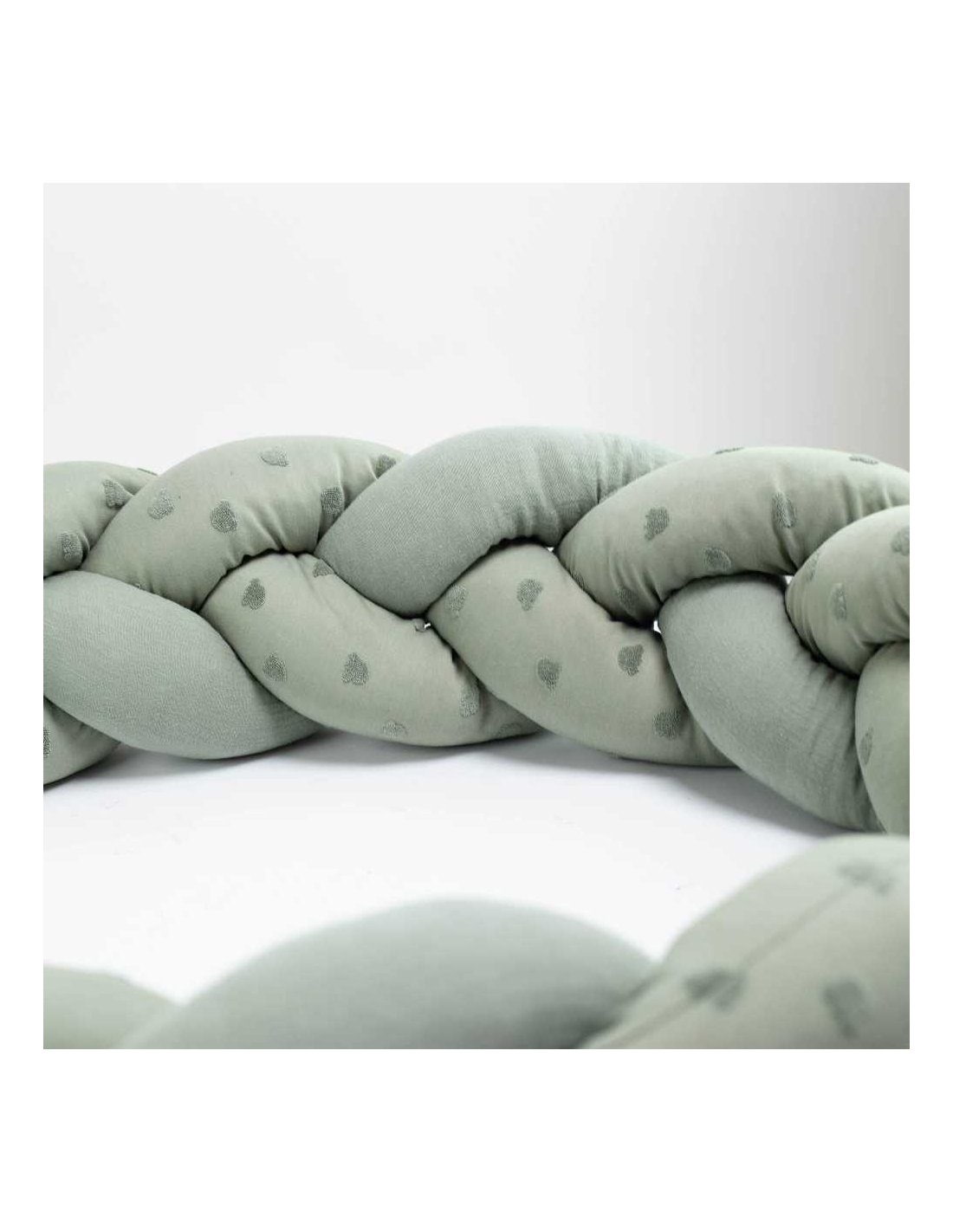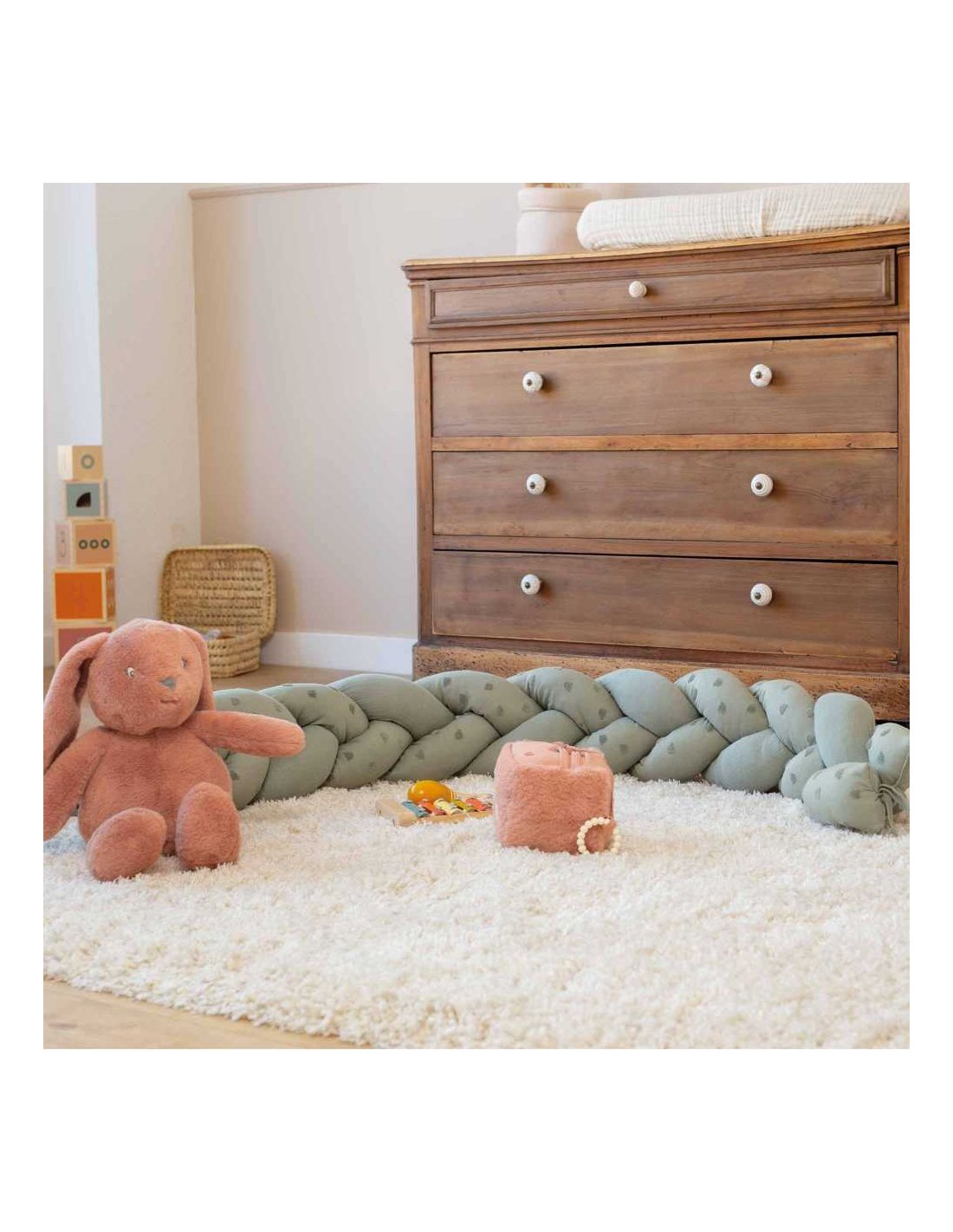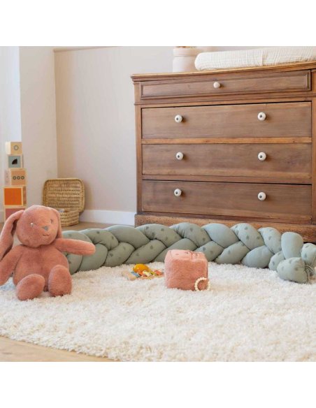 Souple mais suffisamment rembourrée, la tresse est composée de trois brins entremêlés et se fixe facilement grâce à de petits liens cousus aux extrémités. Une fois installée, elle reste bien en place tout en conservant son aspect moelleux et réconfortant. Son motif vichy intemporel s’adapte aussi bien aux chambres classiques qu’aux univers plus modernes. Grâce à sa forme modulable, la tresse peut être déplacée facilement et utilisée de différentes manières selon l’aménagement de la pièce.
