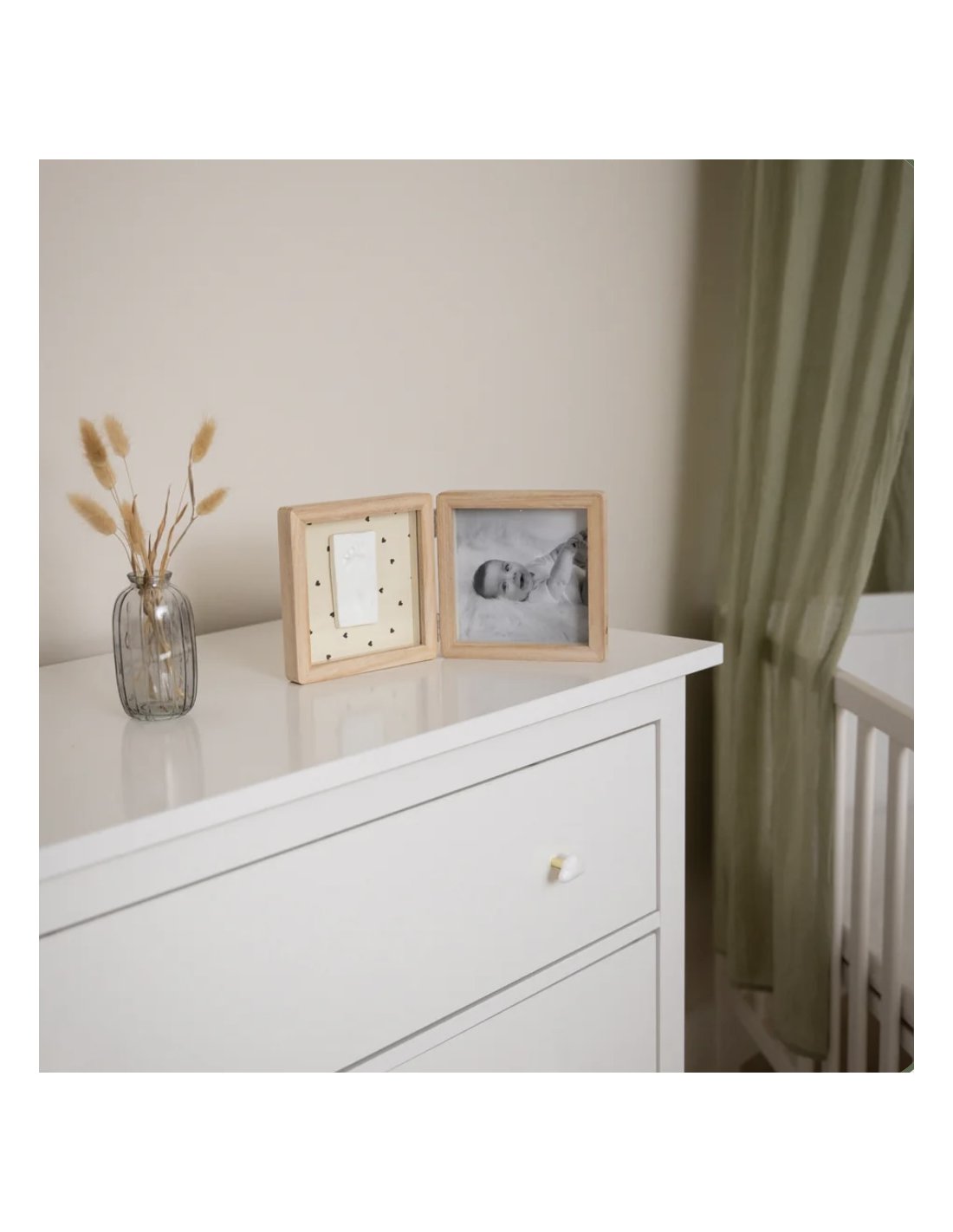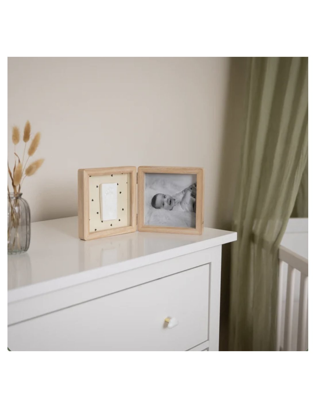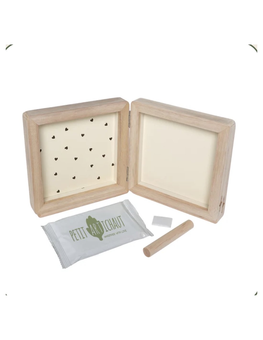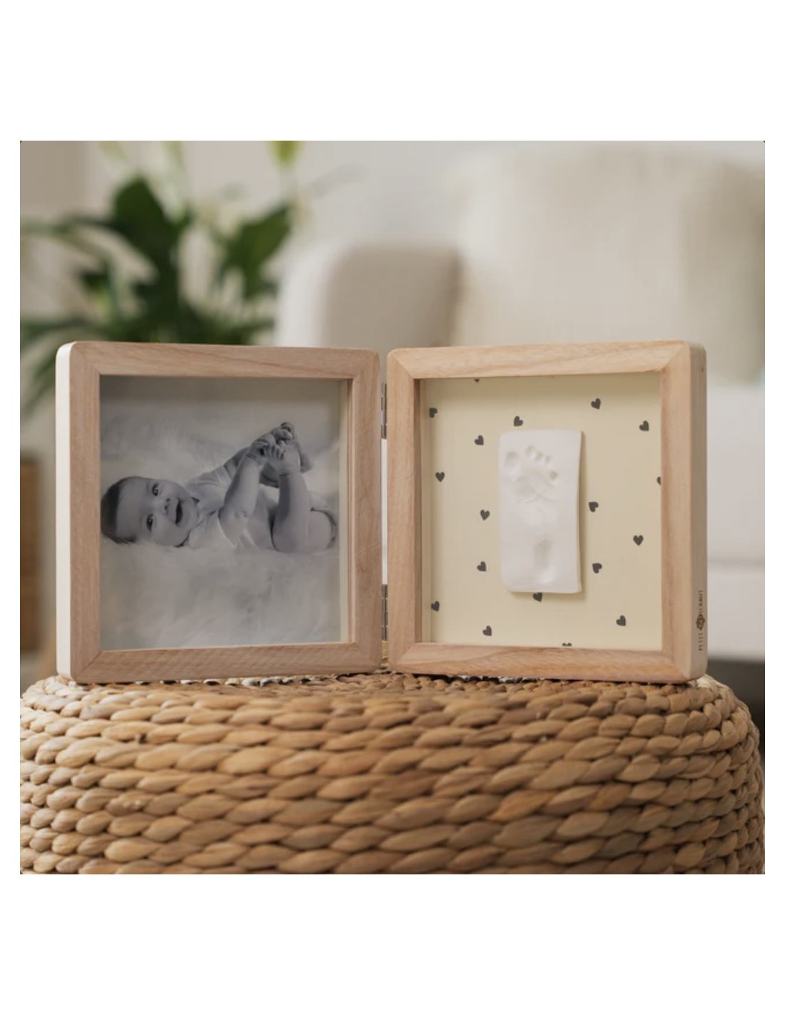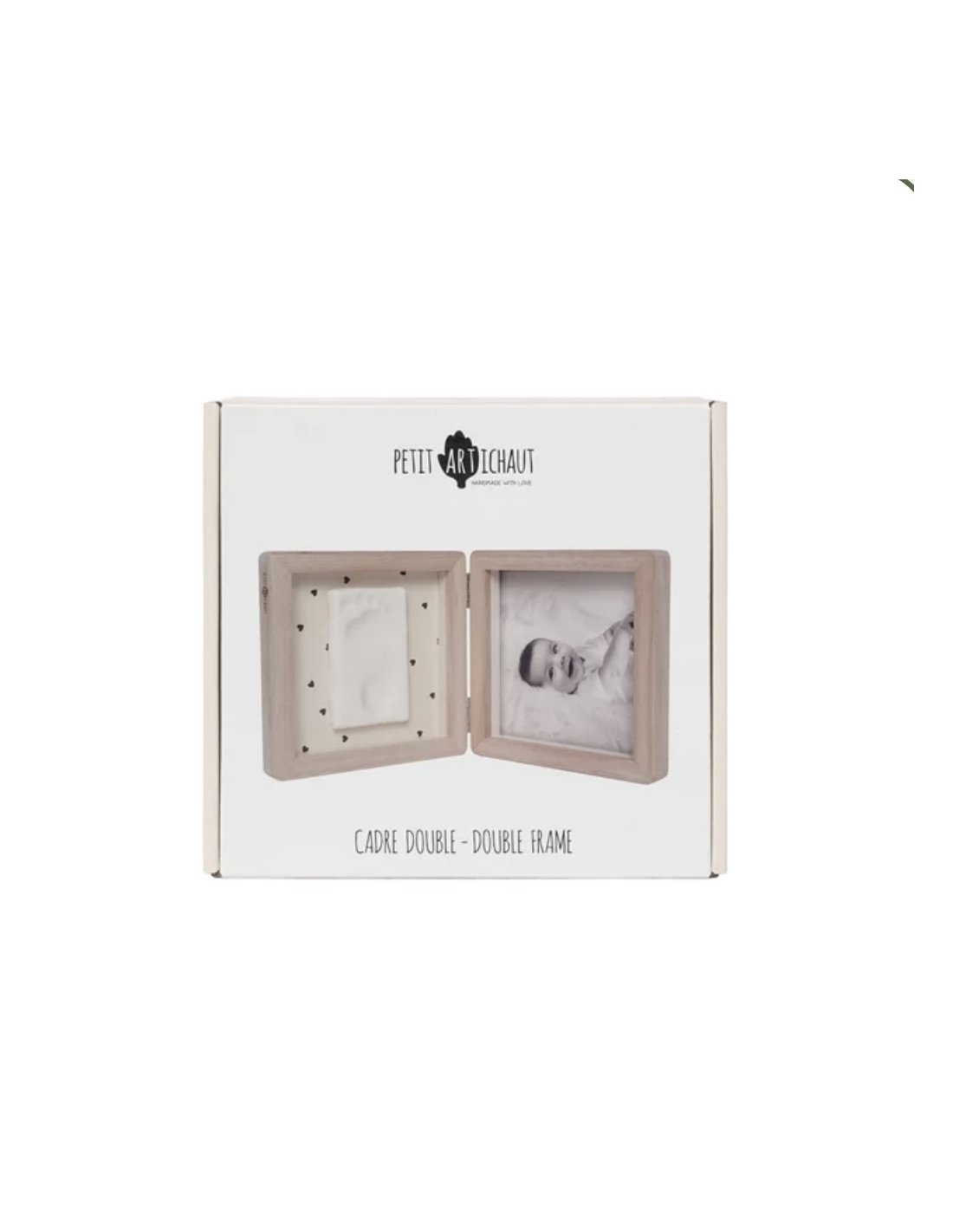 Le cadre Double - Jolis Cœurs offre une manière unique d'exposer à la fois une photo et l'empreinte de bébé. Ce cadre élégant à poser sur un meuble intègre harmonieusement une photo d'un côté et une empreinte de l'autre, sur un fond recto verso de couleur beige avec ou sans motifs cœurs. Le kit comprend de la pâte hypoallergénique, un rouleau et un descriptif pour créer facilement l'empreinte.