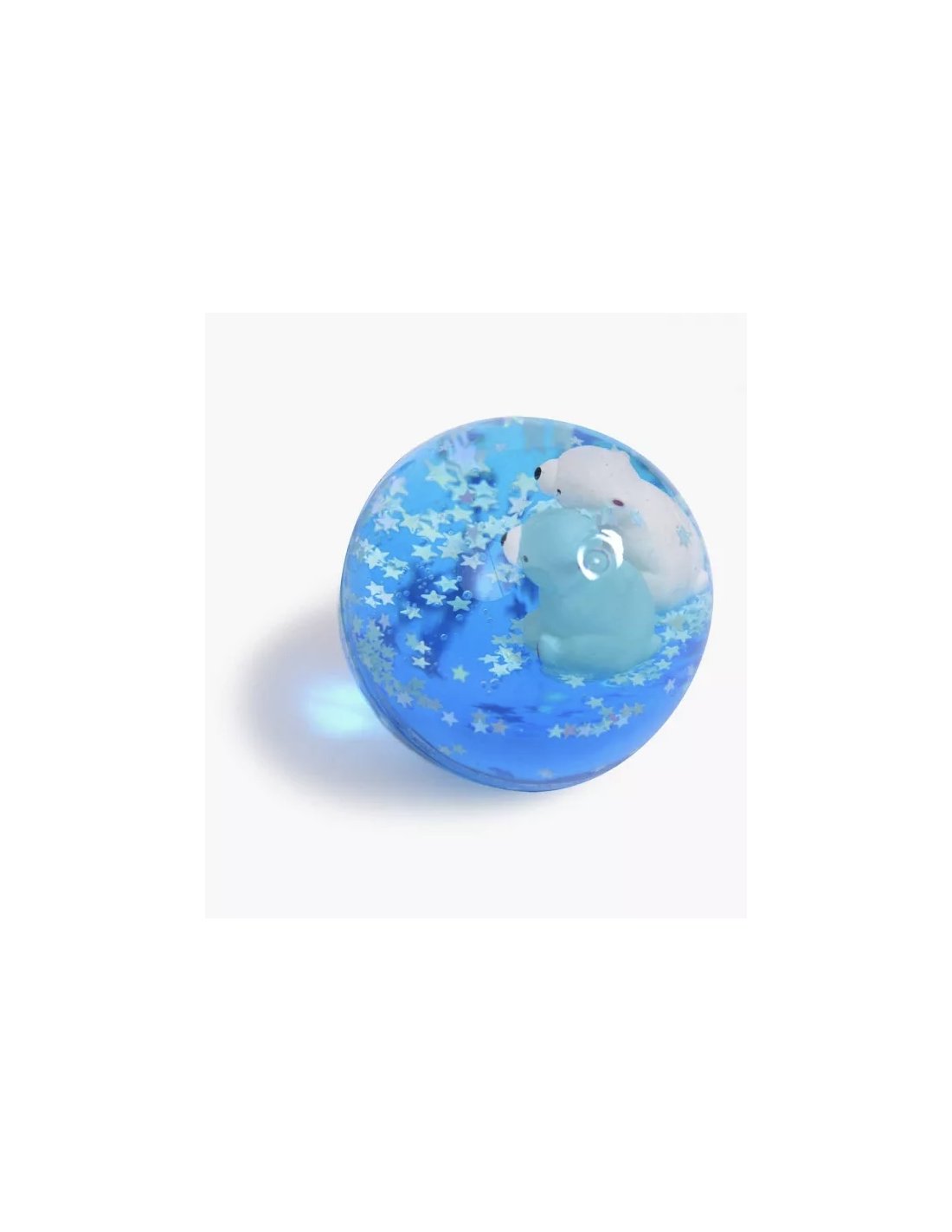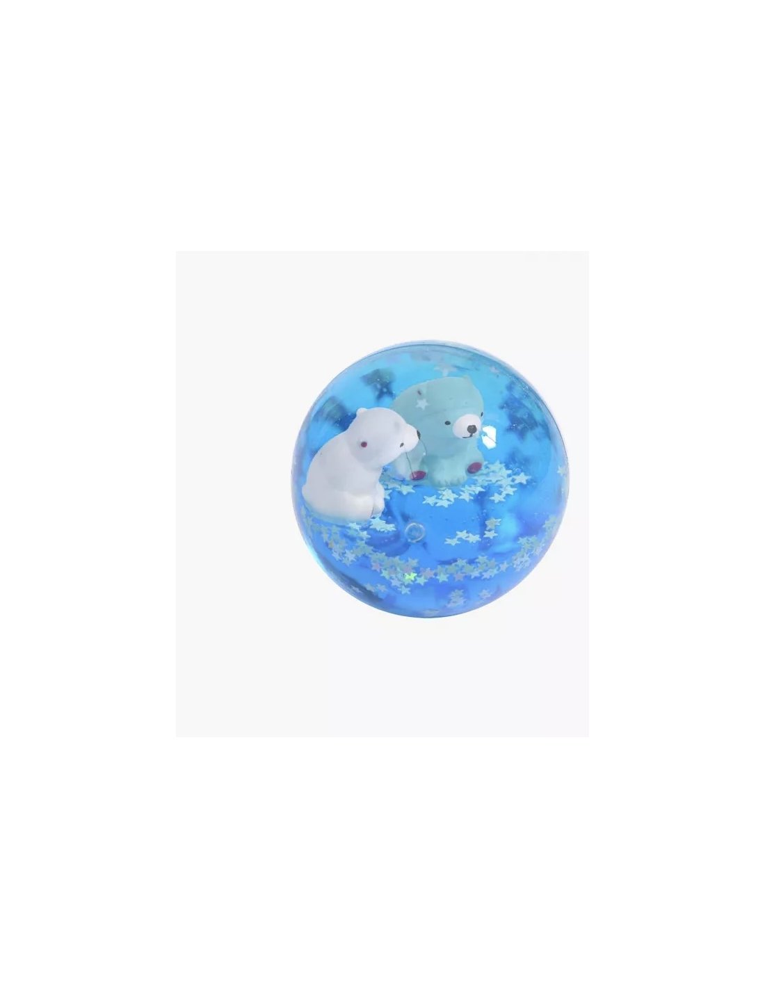 Balle rebondissante remplie de liquide coloré, où l'on voit un ours se baigner au milieu d'étoiles brillantes !