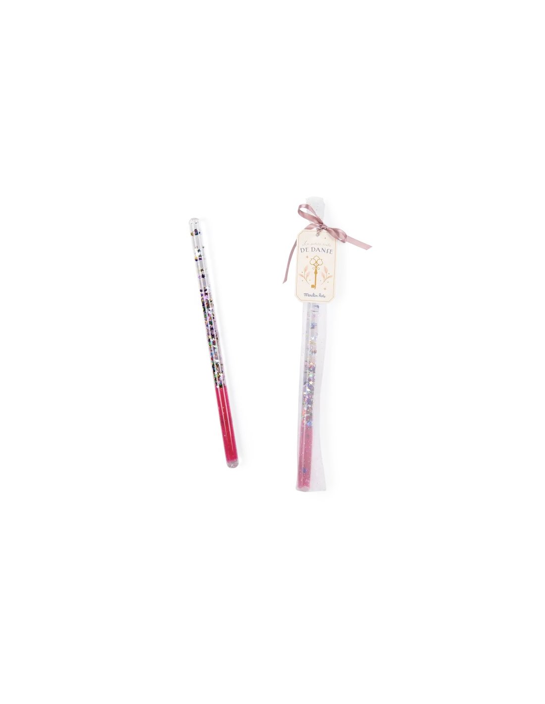 Un peu de poussière d'étoile. un soupçon de magie. tous les sorts sont permis ! Glissée dans son fourreau de tulle. la baguette magique composée d'un tube transparent. est remplie d'un gel rose et de paillettes en forme de cœur. de lune et d'étoiles.