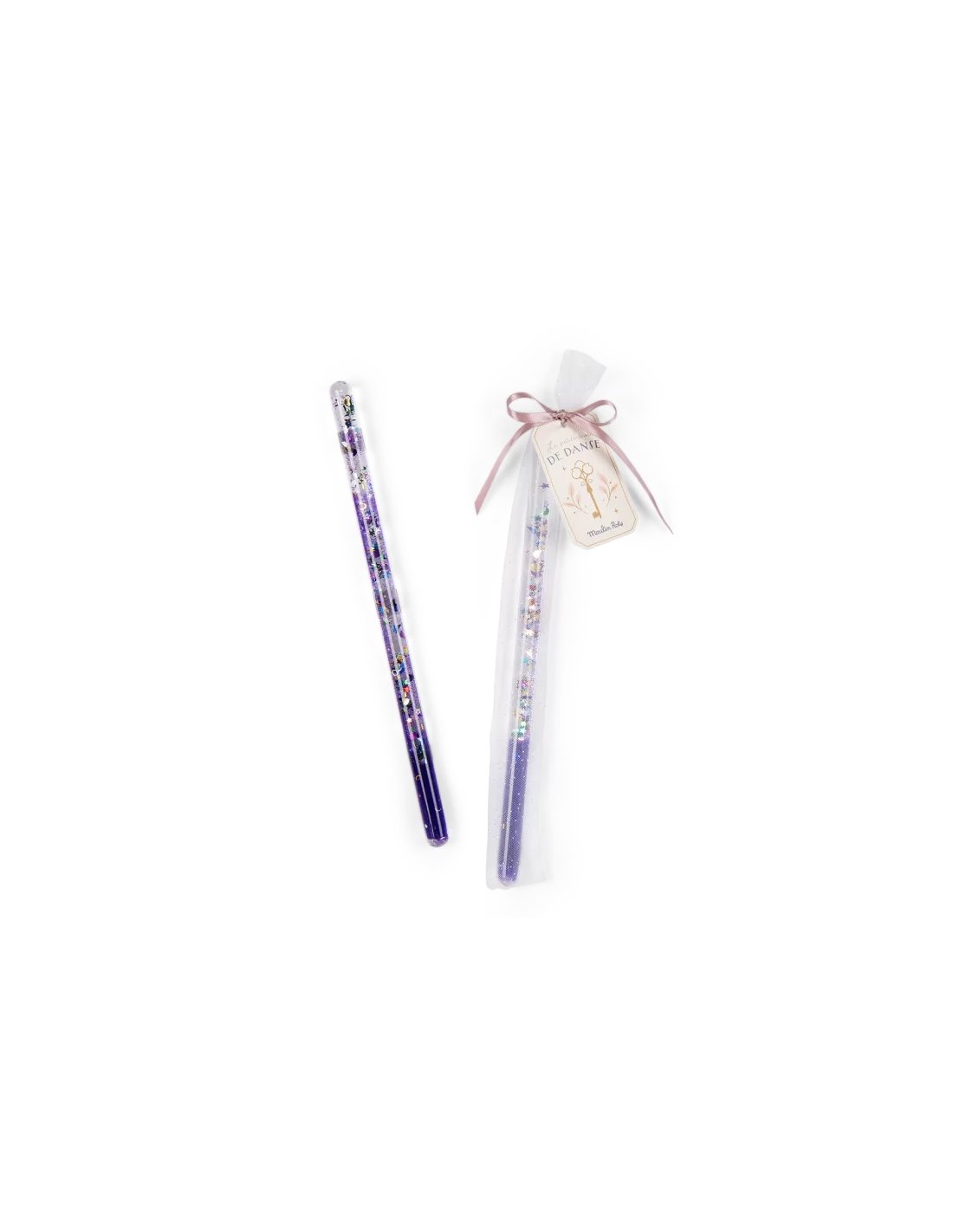 Un peu de poussière d'étoile. un soupçon de magie. tous les sorts sont permis ! Glissée dans son fourreau de tulle. la baguette magique composée d'un tube transparent. est remplie d'un gel rose et de paillettes en forme de cœur. de lune et d'étoiles.