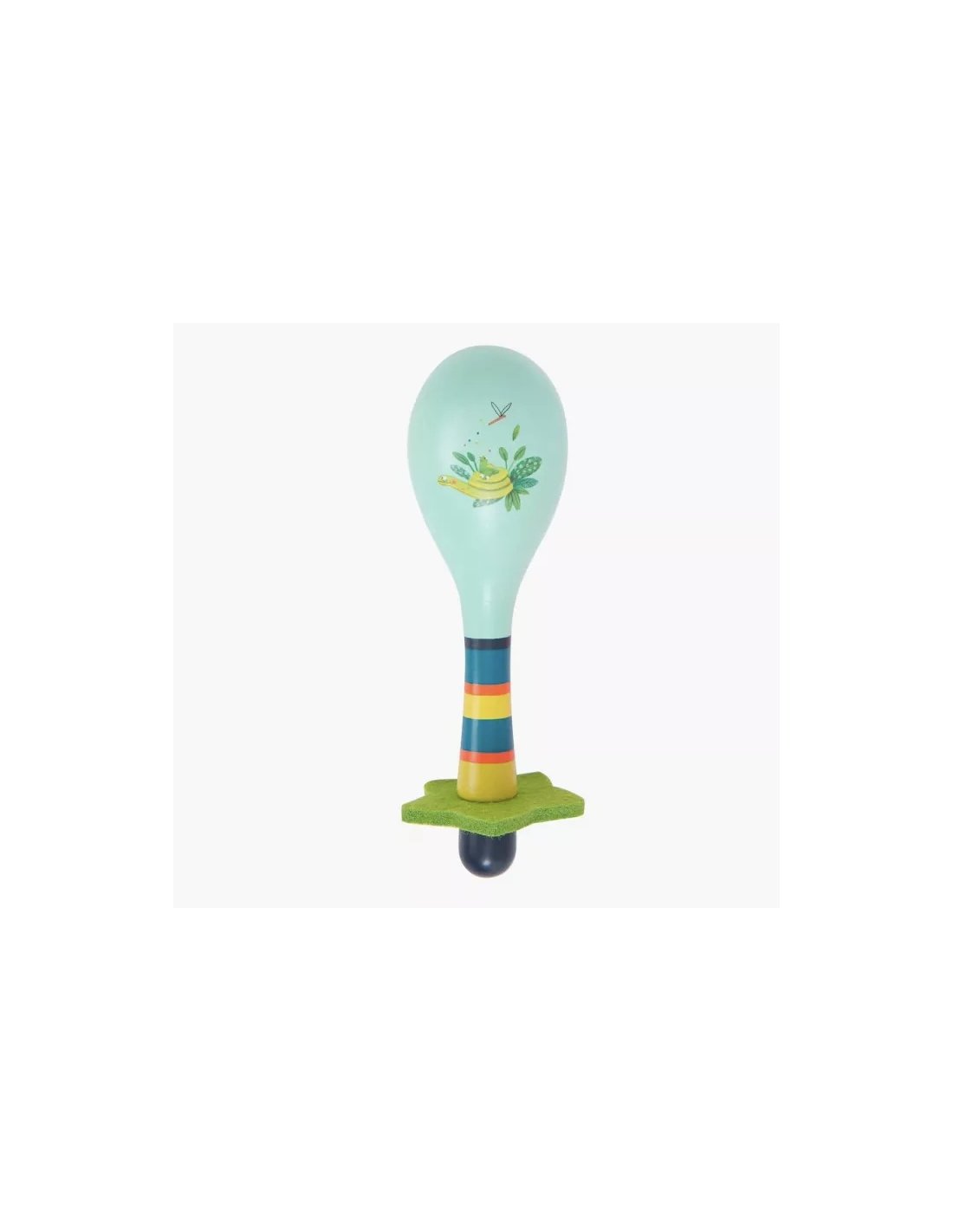 Maracas en bois peinte dans une déclinaison de vert, illustrée d'un serpent au milieu des feuilles de la jungle, et entourée d'une petite fleur en feutrine. Facile à utiliser, elle développe le rythme et l'éveil musical des tout-petits.