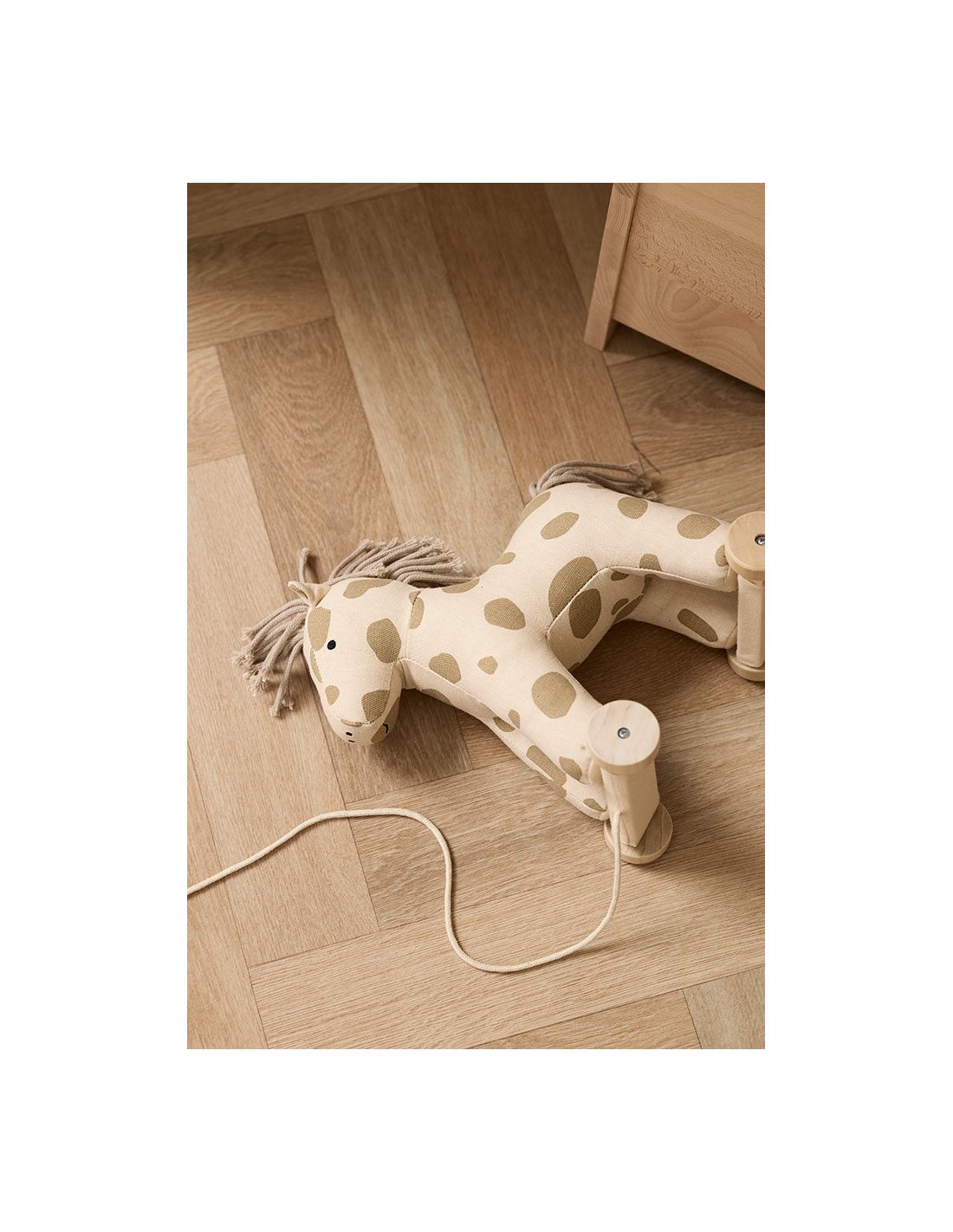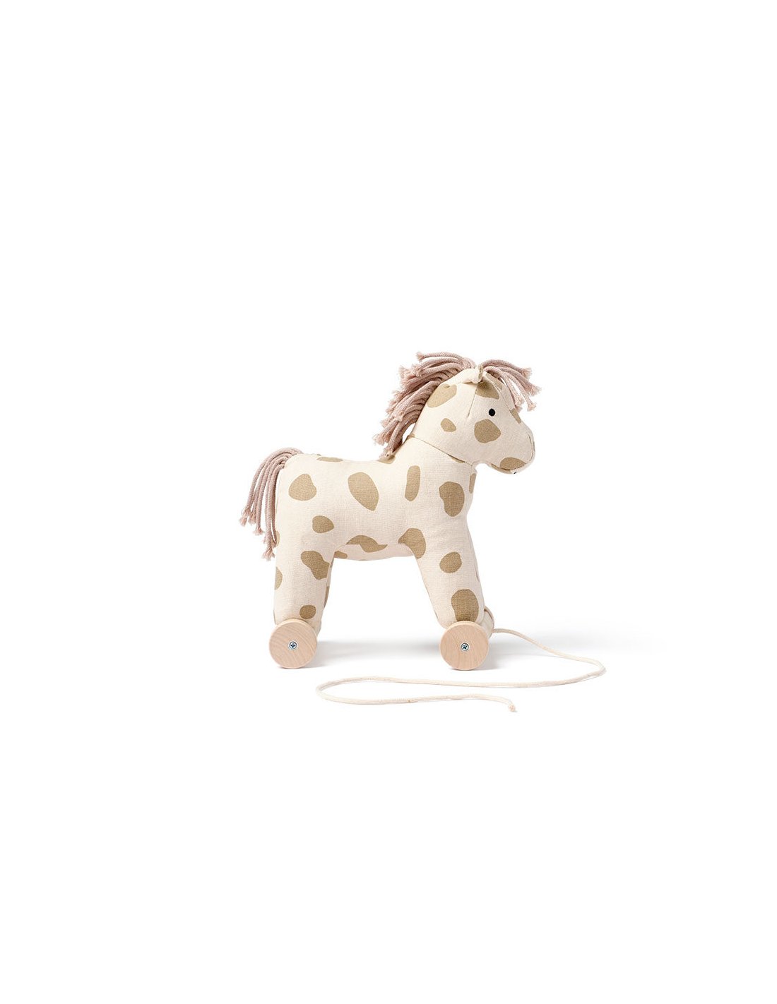 Voici Dotty, un cheval à tirer fabriqué en toile de coton solide avec un motif à pois. Avec sa crinière et sa queue en laine douce, Dotty se prête aussi bien aux câlins qu'aux jeux actifs. La ficelle permet de la tirer facilement lors des promenades, ce qui aide les enfants à travailler leur équilibre et leur coordination. Les roues peuvent être retirées, transformant Dotty en un jouet doux pour les moments plus calmes ou pour jouer à faire semblant. La taille de Dotty la rend facile à transporter, que ce soit pour partir à l'aventure ou pour trouver une place sur une étagère lorsque la récréation est terminée. Un compagnon pour les étapes occupées et les moments calmes.