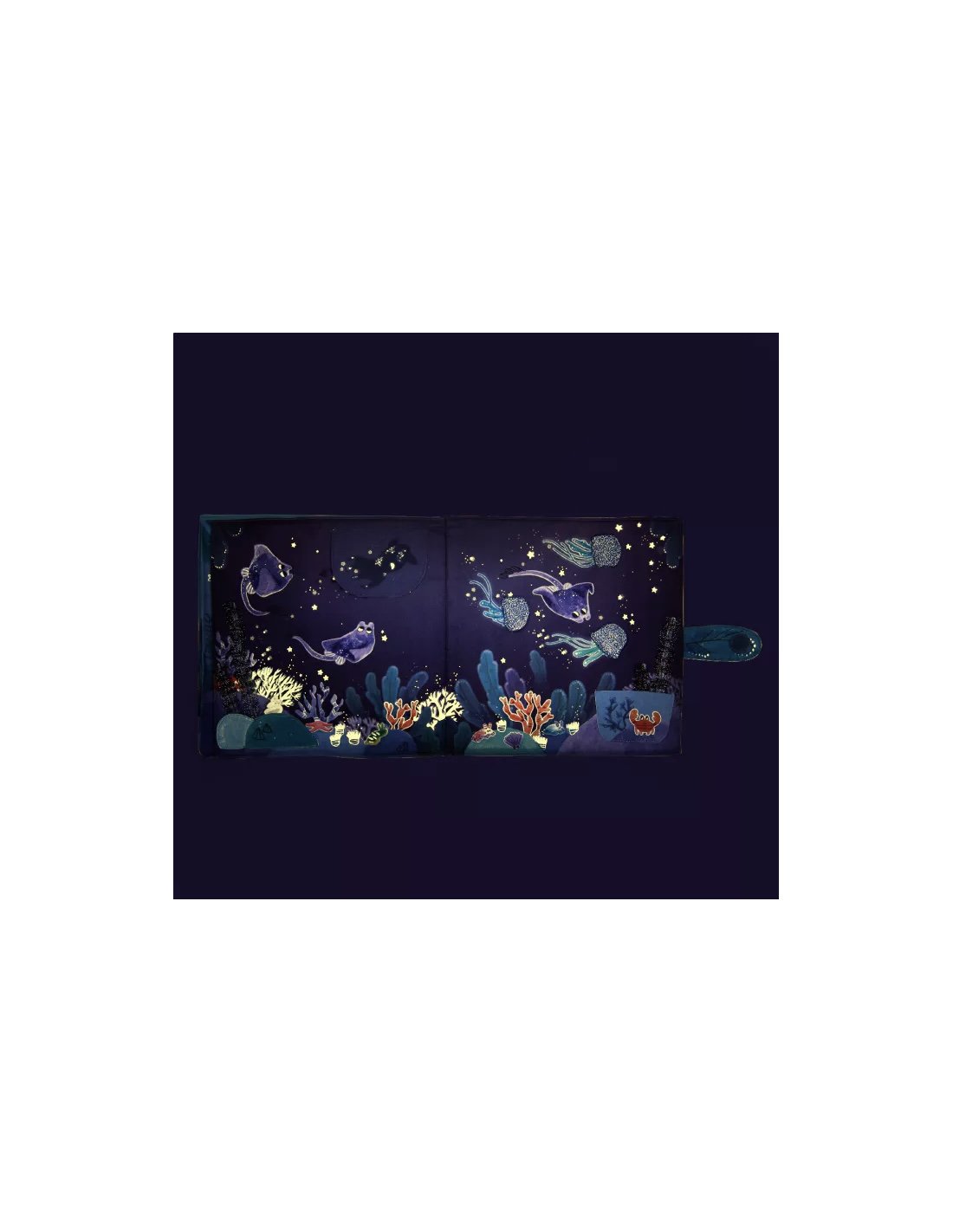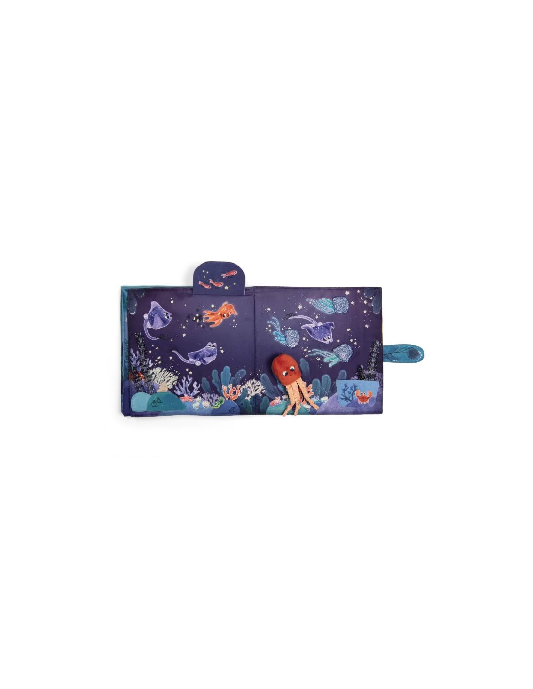 Grand livre en tissu portant sur le thème emblématique des fonds marins. Le hochet poulpe peut se glisser dans une cachette à chacune des 6 pages d'activités sensorielles. Les dernières pages sont phosphorescentes pour illustrer les fonds marins.