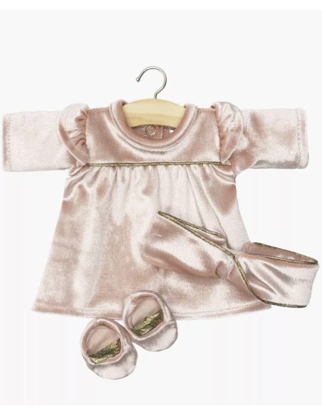 - une robe Mélodie à manches longues en velours vieux rose avec passepoil lurex mordoré,