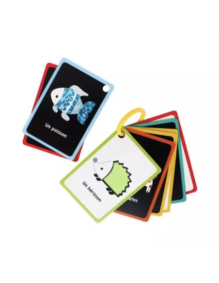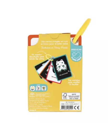 Avec ces cartes qui proposent un imagier en noir avec des matières à toucher et des effets, les premiers sens de bébé sont sollicités : - la vue avec les contrastes - le toucher avec les effets et matières - la motricité avec la manipulation des cartes Les cartes d'éveil peuvent s'utiliser ensembles ou séparément grâce à l'anneau détachable !