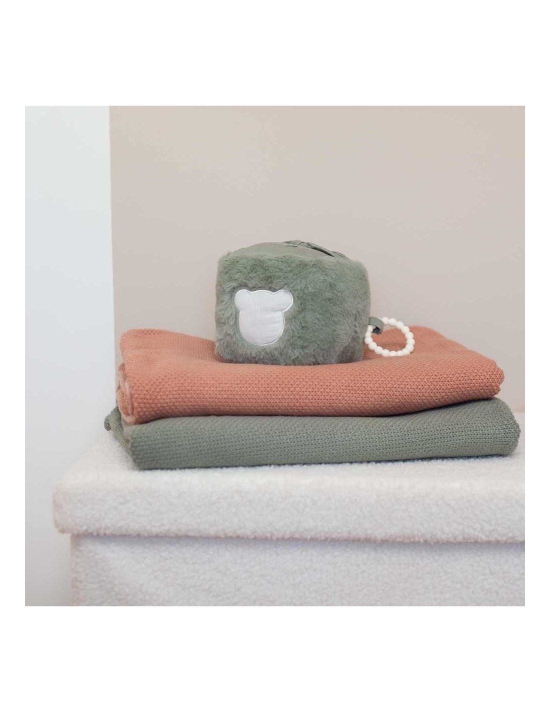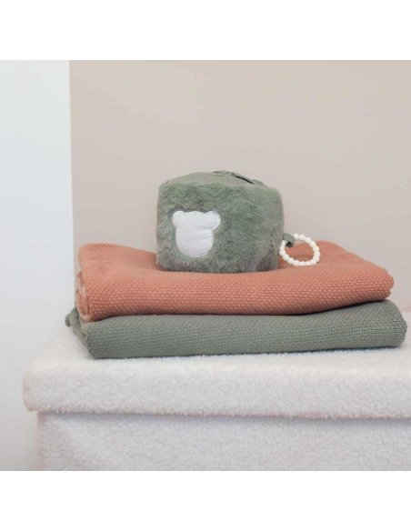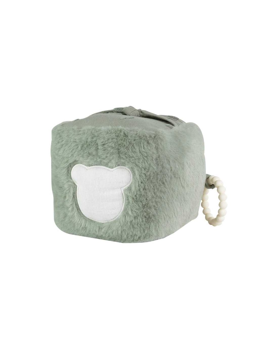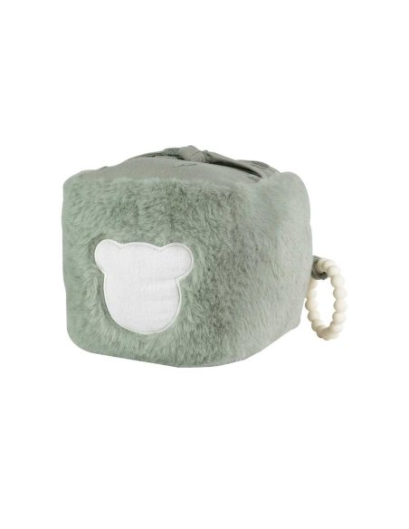 Chaque face du cube offre une expérience différente. Le miroir attire le regard et aide l’enfant à découvrir son reflet. Le pouet intégré stimule l’ouïe et encourage les gestes répétés. Le papier bruissant éveille la curiosité grâce à un son doux et intrigant. L’anneau de dentition, placé sur une face, soulage les gencives lors des poussées dentaires. Les surfaces en peluche et en mousseline de coton apportent quant à elles un confort tactile et une sensation de douceur. La petite tête d’ourson renforce le côté ludique et affectif de ce jouet.