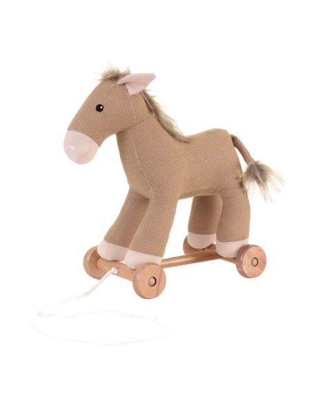 De petites jambes traversent la pièce en titubant, tirant leur doux compagnon cheval derrière elles. Le doux grondement des roues en bois transforme chaque pas en aventure.