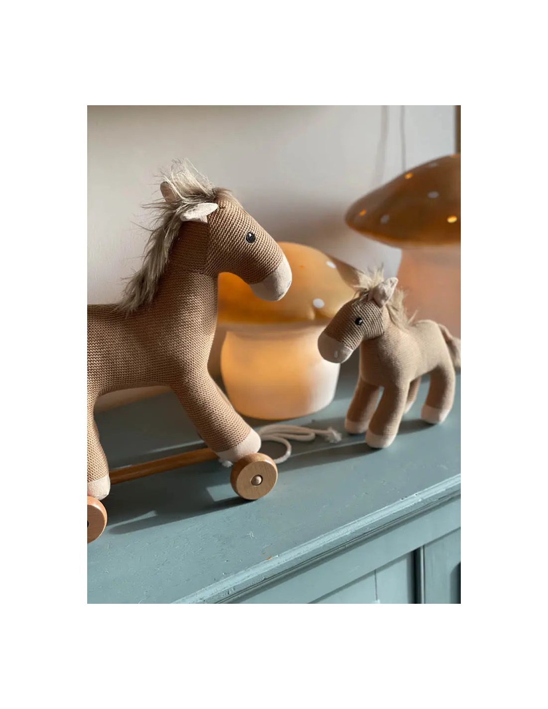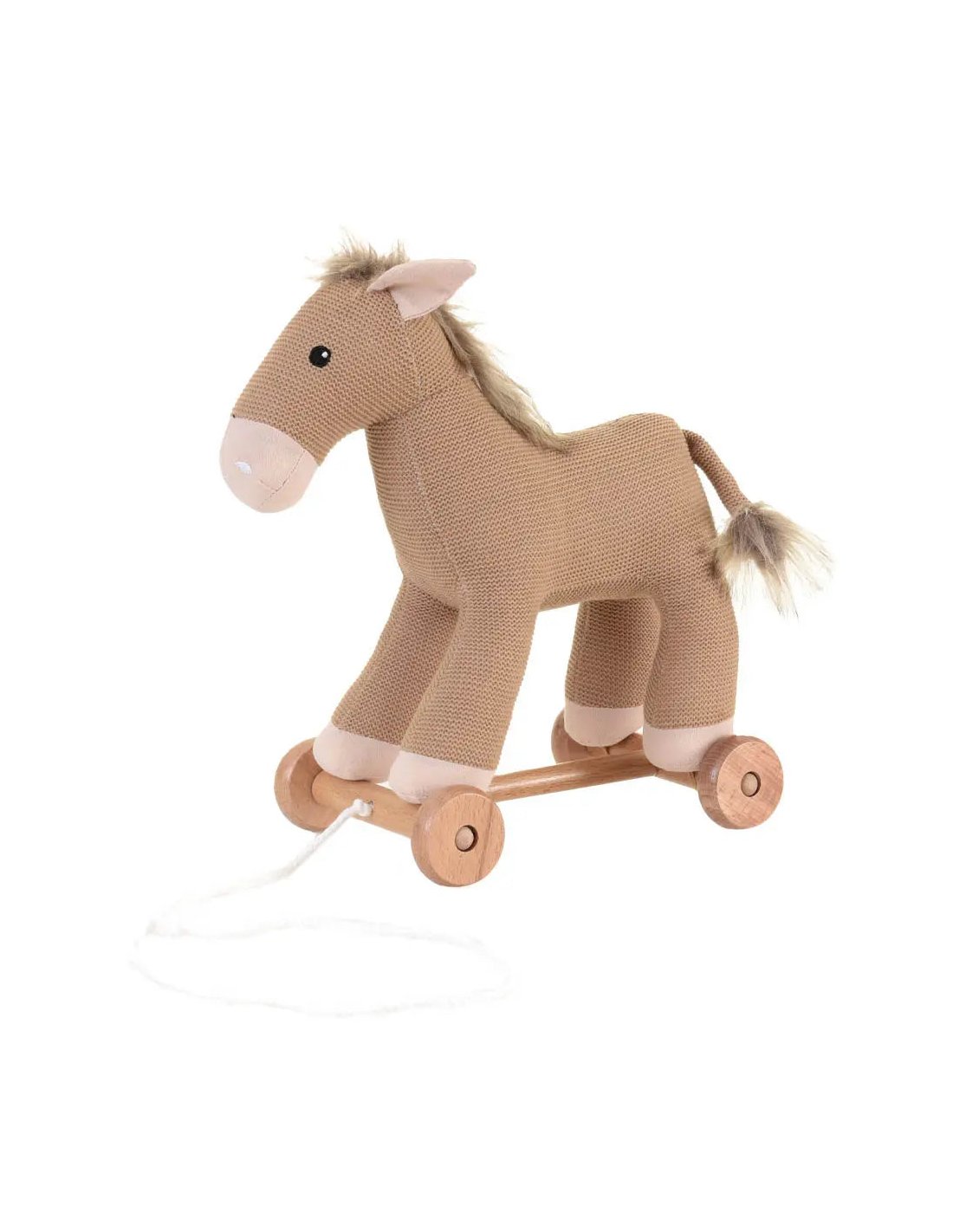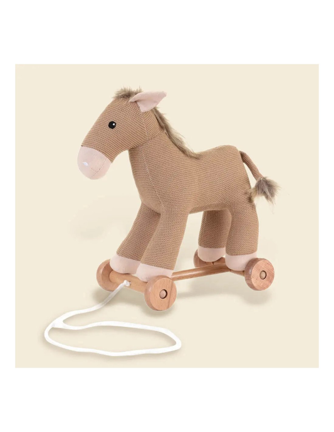 De petites jambes traversent la pièce en titubant, tirant leur doux compagnon cheval derrière elles. Le doux grondement des roues en bois transforme chaque pas en aventure.