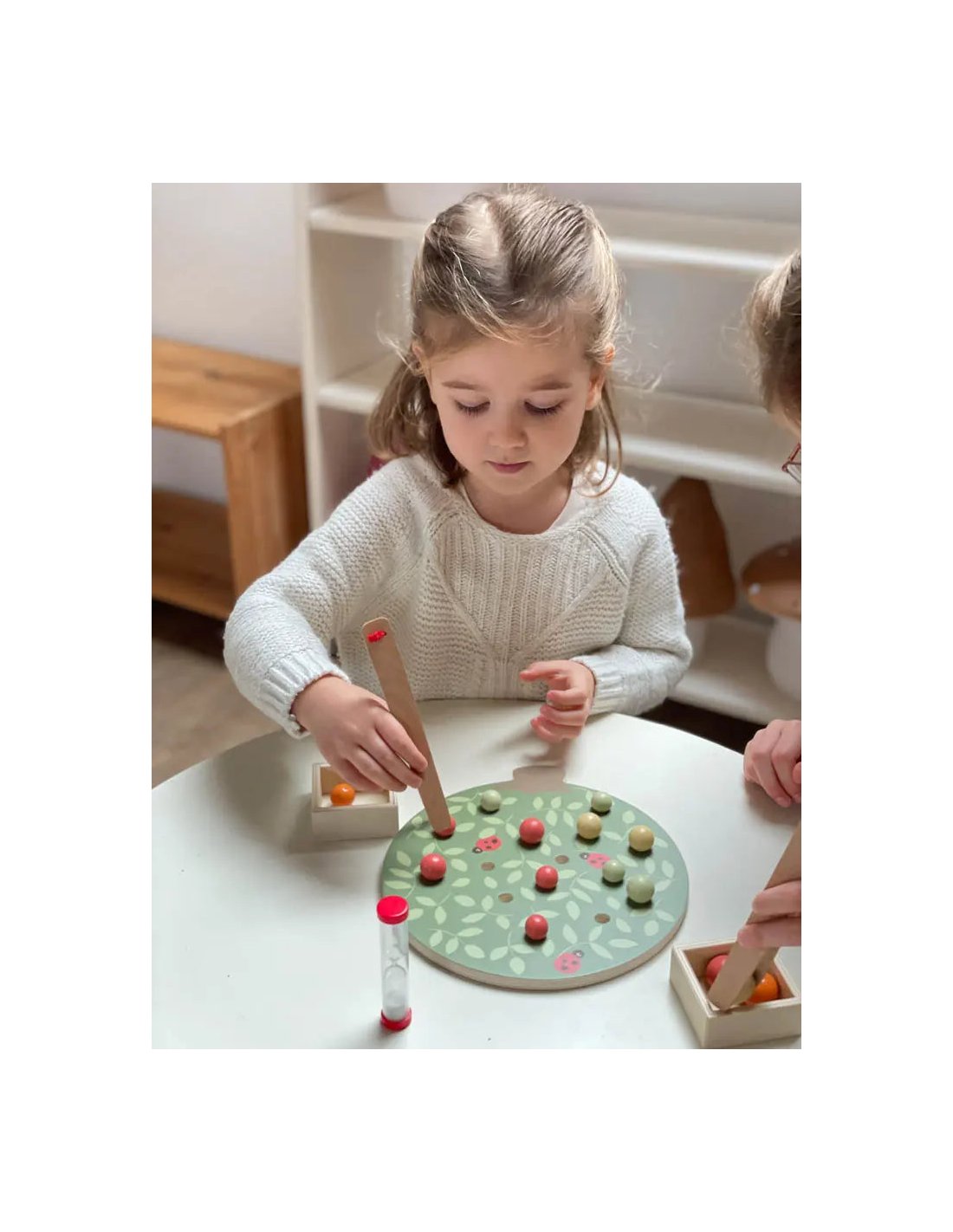 De petits doigts saisissent une pince en bois lisse et extraient délicatement des boules colorées de leurs cachettes feuillues. Les joyeuses coccinelles regardent les petits s'élancer contre le sablier, transformant un simple exercice d'équilibre en une aventure hilarante.