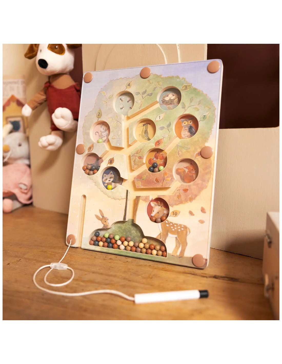 Regardez les petits doigts guider des perles de bois colorées à travers les méandres des arbres grâce à une baguette magnétique magique. Chaque poche abrite un animal de la forêt différent – cerf, hibou, renard et lapin – qui attend d'attraper ses perles préférées dans ce labyrinthe enchanteur.
