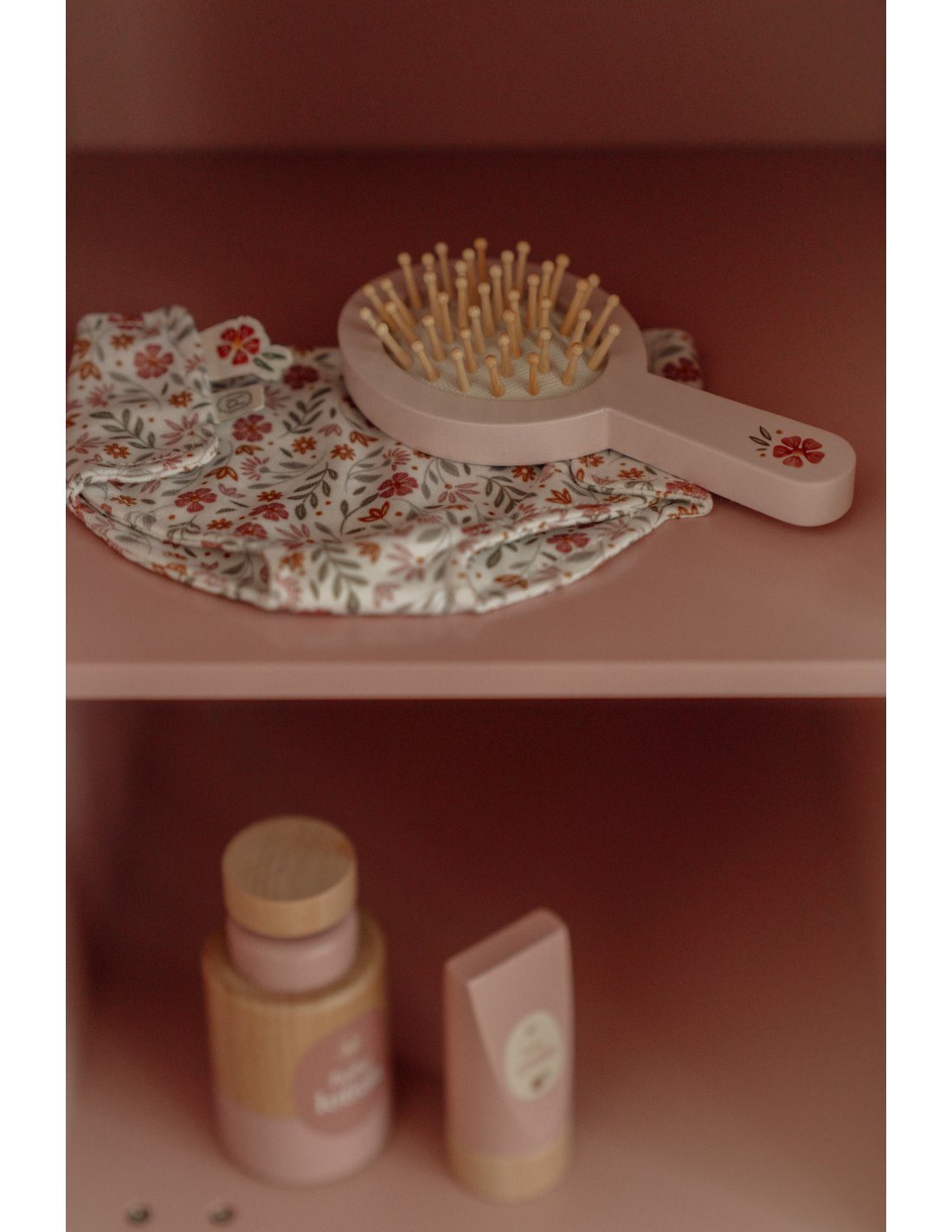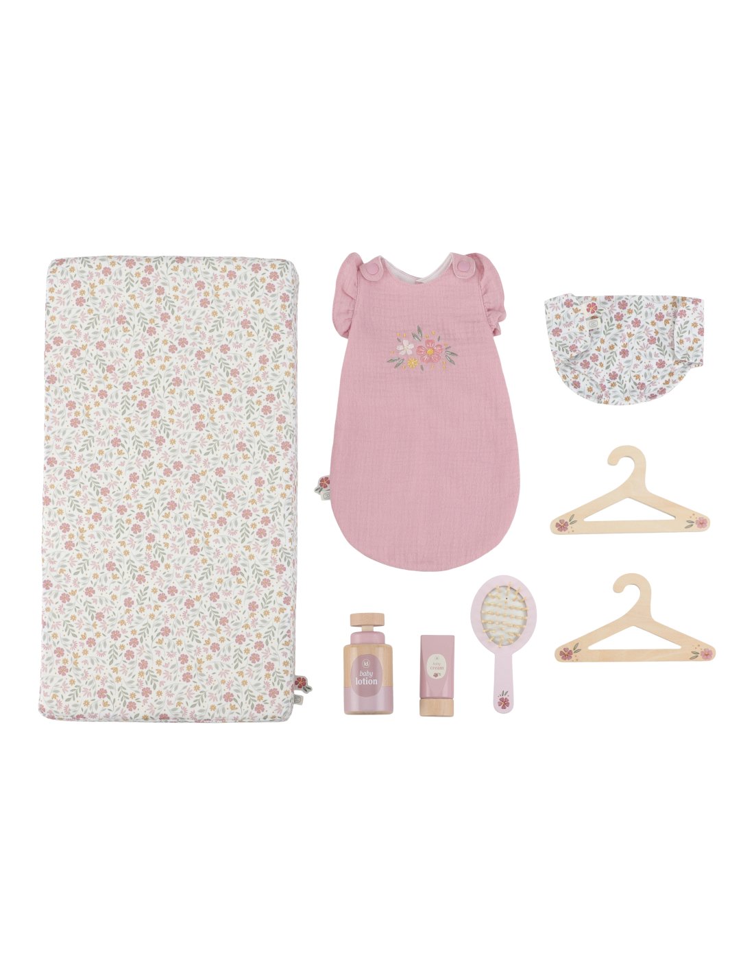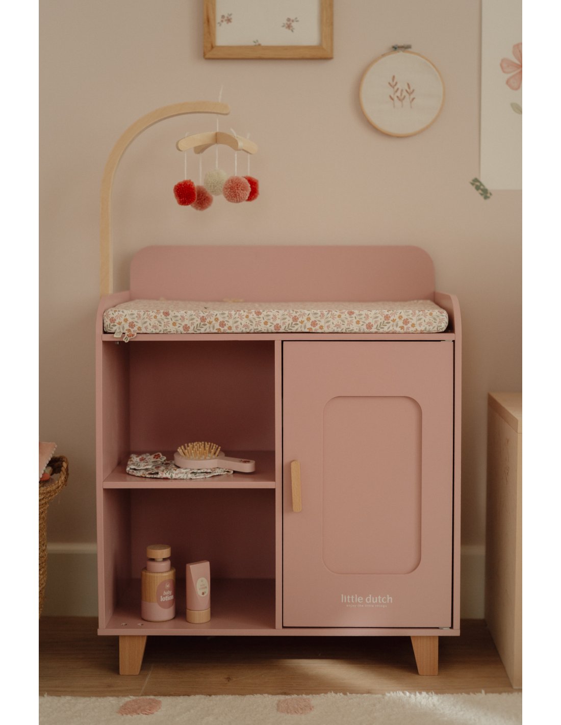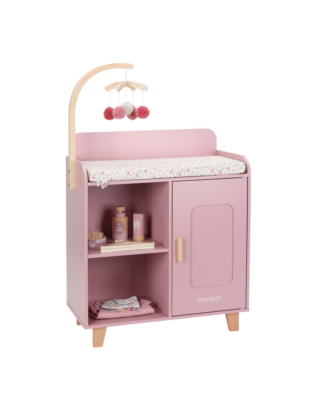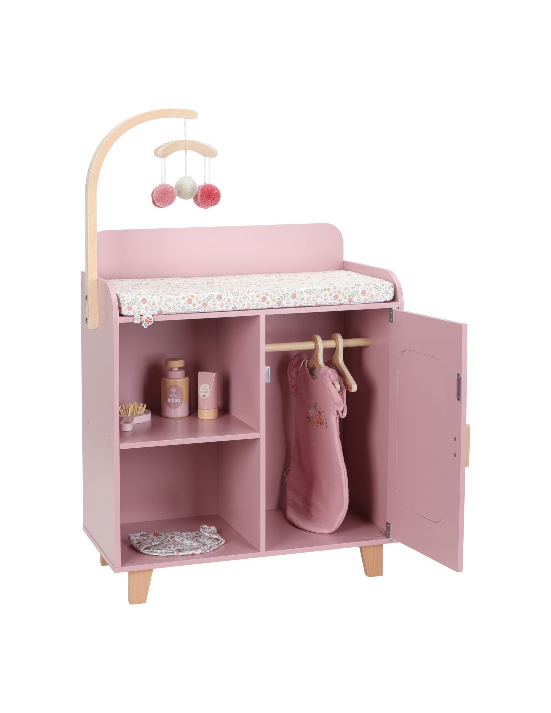 Cette table à langer en bois propose tout le nécessaire pour s'occuper avec soin de son poupon préféré. L’ensemble comprend un mobile, un matelas à langer tout doux au design soigné, ainsi que plusieurs accessoires de soins en bois. Elle est également équipée d’une couche, d’un sac de couchage et de jolis cintres pour ranger les tenues. L’armoire intégrée offre un espace de rangement pratique pour garder à portée de main tous les indispensables.