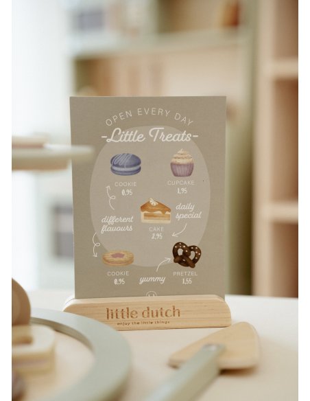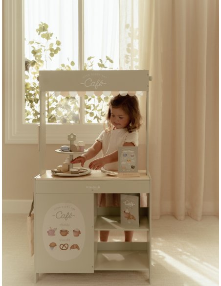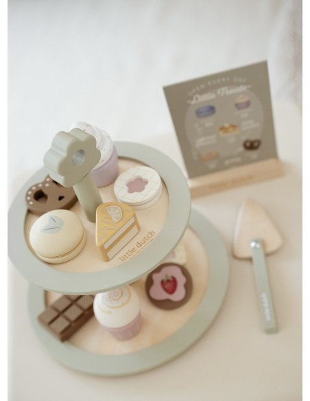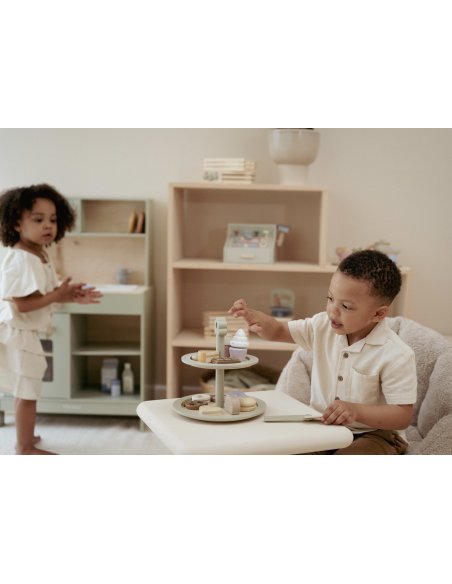 C’est l’heure du thé ! Ce ravissant présentoir en bois est parfait pour organiser un délicieux goûter. Réparties sur deux étages, les pâtisseries — muffins, biscuits et macarons colorés — sont aussi jolies qu’appétissantes. Grâce à la pelle à gâteau et au menu illustré, les petits hôtes peuvent servir leurs invités avec soin et créativité. Un accessoire charmant pour encourager le jeu de rôle, l’imagination et les moments partagés entre amis, peluches ou poupées.