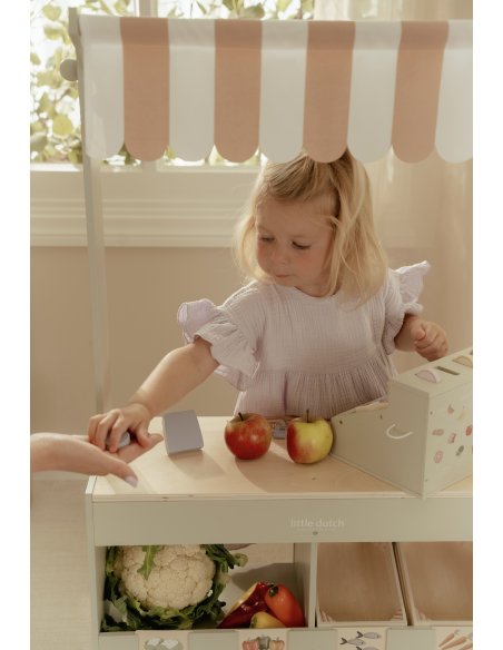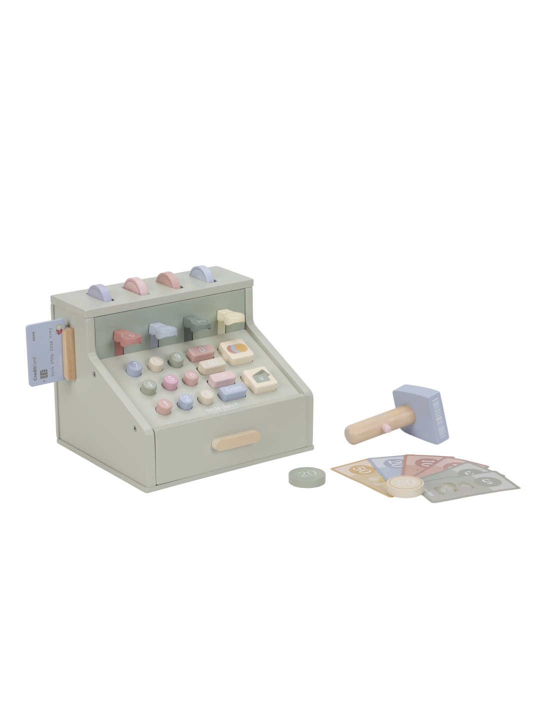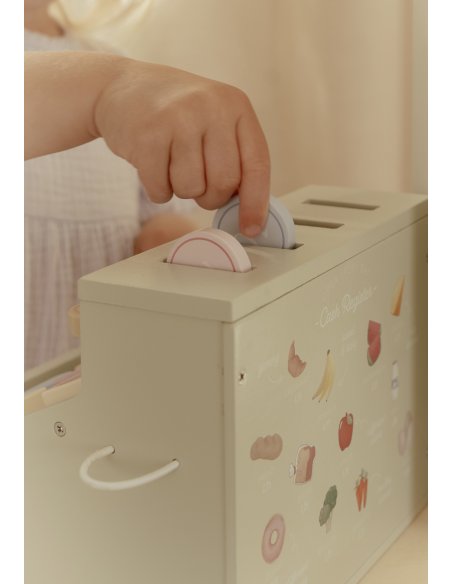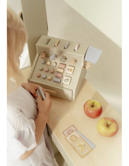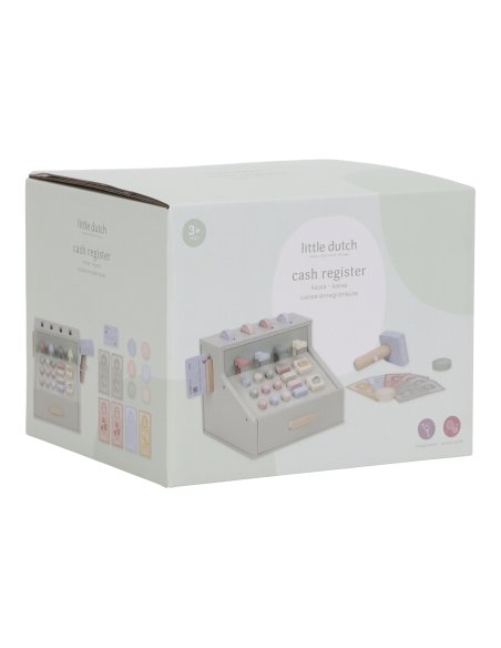 Calculez, scannez, encaissez ! Avec cette jolie caisse enregistreuse en bois, jouer à la marchande devient encore plus amusant et réaliste. Elle est équipée d’un scanner, de boutons, d’un tiroir-caisse pour les pièces et billets, ainsi que d’un lecteur de carte pour les paiements par carte bancaire. Les enfants peuvent choisir entre payer en espèces ou par carte, comme dans un vrai magasin ! Un excellent moyen de découvrir les bases du calcul, de l’échange et de la gestion de l’argent tout en s’amusant. Qu’allez-vous acheter aujourd’hui ?
