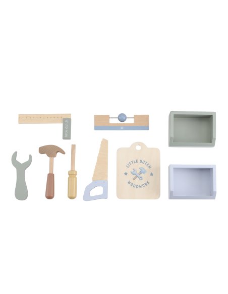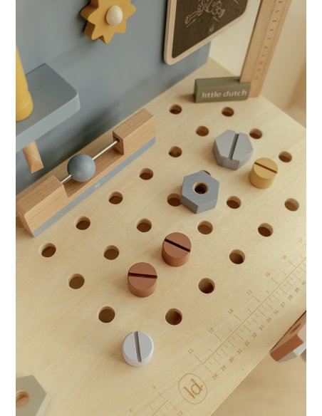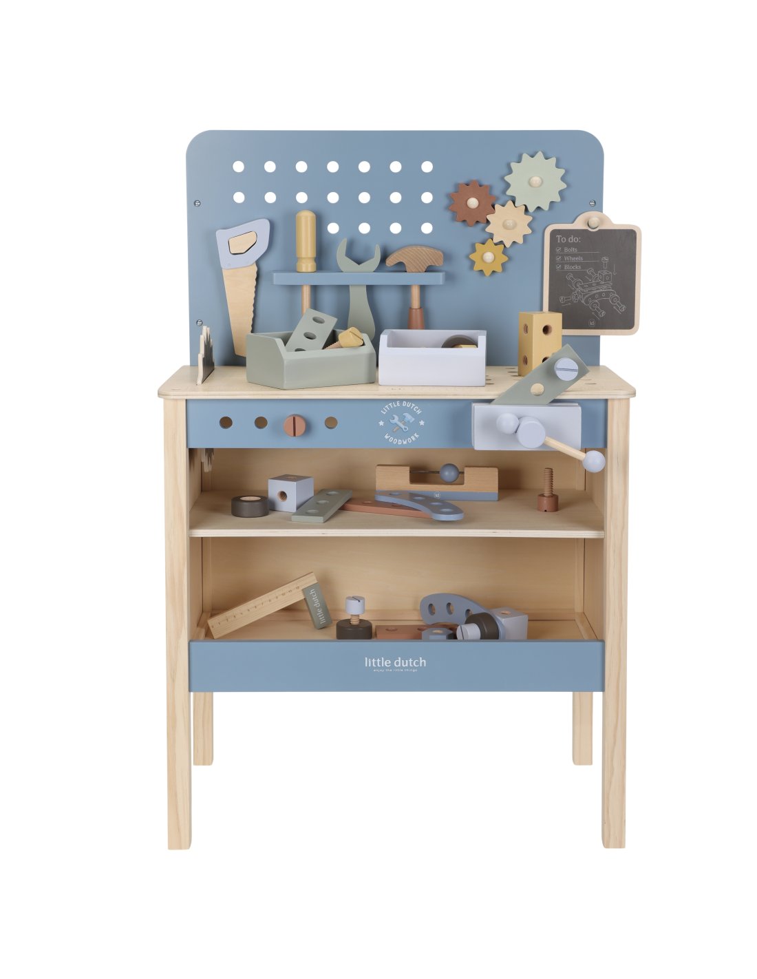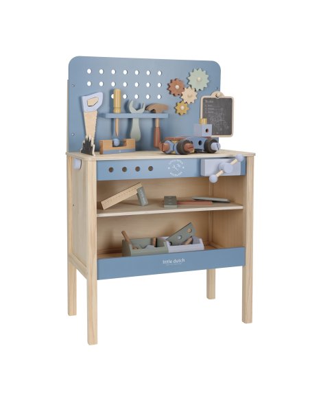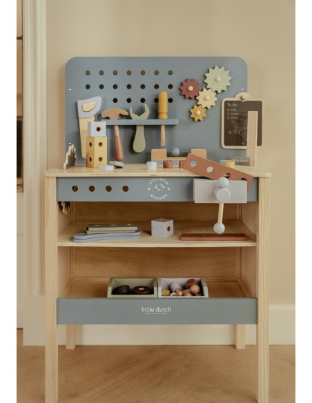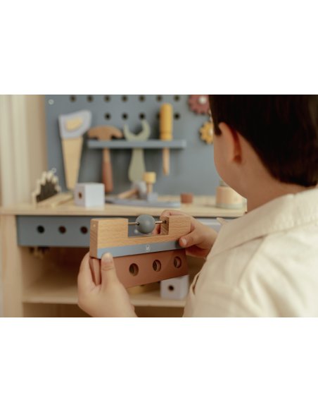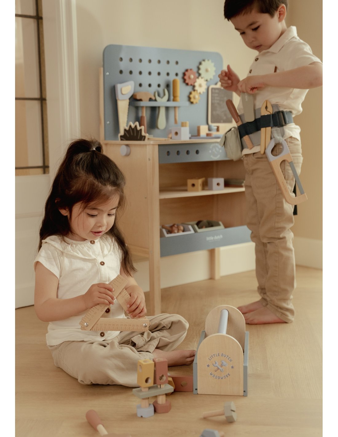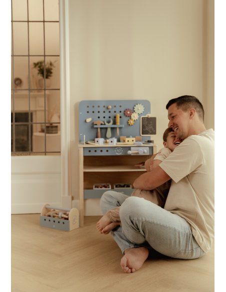 Un atelier pour les petits bricoleurs ! Quel que soit le projet imaginé, cet établi en bois permet de construire à l’infini. Il suffit de prendre les outils et de commencer à assembler. Voiture, moto ou toute autre création prennent forme grâce aux nombreuses pièces incluses. Cet établi offre l’occasion aux enfants de s’initier au bricolage en toute sécurité. Scier, visser, réparer… de multiples activités favorisent la concentration et l’autonomie. Chaque création peut être démontée et recommencée, pour des heures de jeu. L'établi stimule le jeu de rôle, développe la motricité fine, la créativité et l’imagination. Il est équipé d’une étagère, d’un tableau pour noter les tâches à réaliser, de deux compartiments de rangement et d’un étau. Le set comprend 55 pièces : boulons, écrous, vis, panneaux, roues et outils essentiels tels qu’un marteau, une scie, un tournevis, un niveau et d'un mètre pliant. Avec son design solide et ses couleurs tendance, cet établi s’intègre aussi bien dans une chambre d’enfant que dans une pièce de vie. À associer avec la boîte à outils assortie pour enrichir l’expérience de jeu.