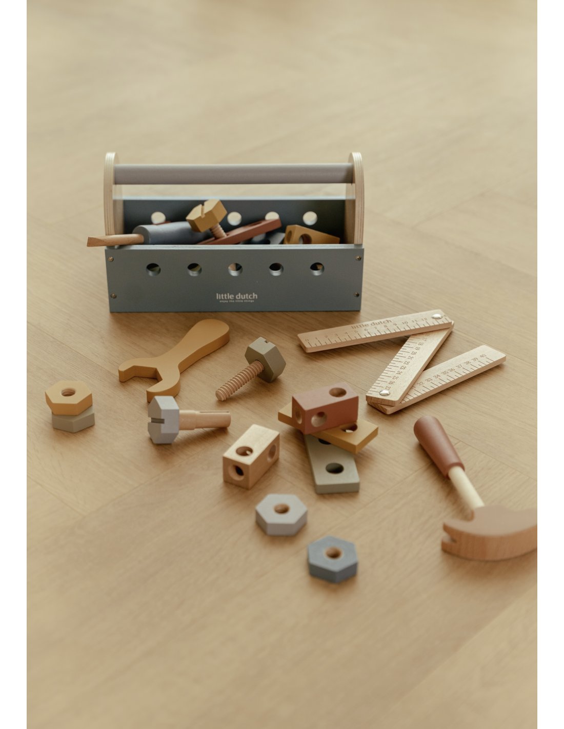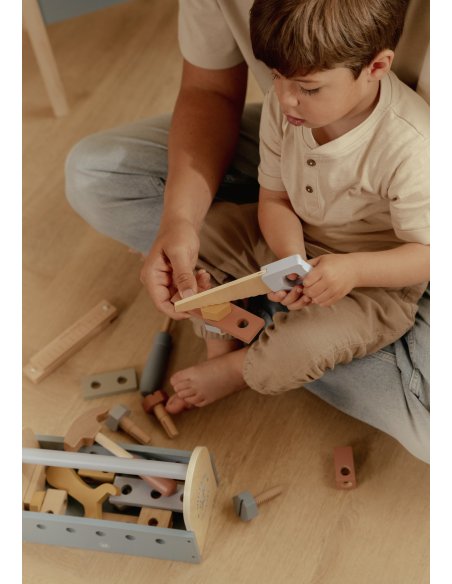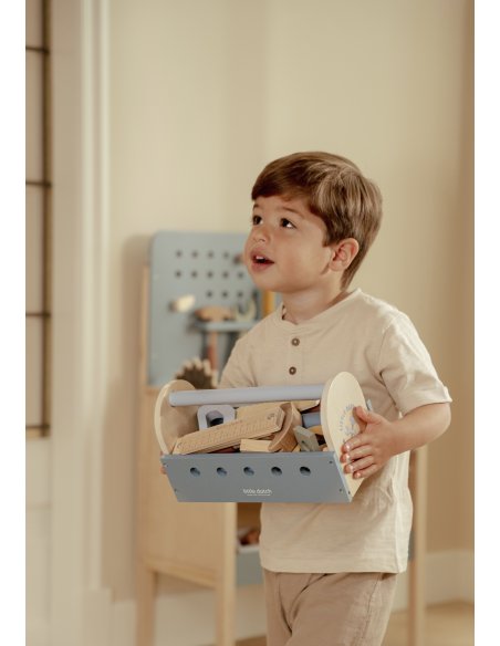 Participez au bricolage dans la maison ! Cette boîte à outils pratique permet de réaliser toutes sortes de projets. Elle comprend un marteau, un tournevis et une clé, ainsi que diverses pièces comme des panneaux, des boulons et des écrous, pour visser et assembler facilement. Saviez-vous que cette boîte ne sert pas uniquement à ranger les outils ? Elle peut aussi faire office de banc à marteler !Cet ensemble stimule le jeu de rôle tout en développant la motricité, la créativité et l’imagination. Pour aller plus loin, ajoutez un établi afin de créer un véritable atelier et permettre une immersion complète dans le jeu. Des heures de plaisir assurées pour les petits bricoleurs en herbe !