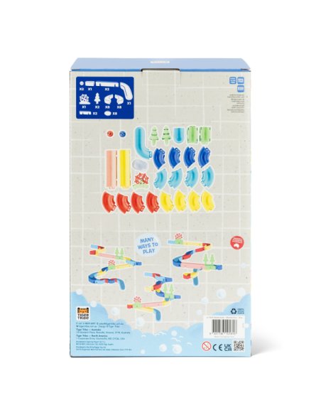 Jouet de bain amusant Tiger Tribe sous la forme d'une toboggan à billes qui, avec ses 25 éléments de construction, garantit des heures de plaisir dans le bain, car il peut être assemblé d'innombrables façons. En plus des éléments de construction, 2 balles et 8 ventouses sont incluses.