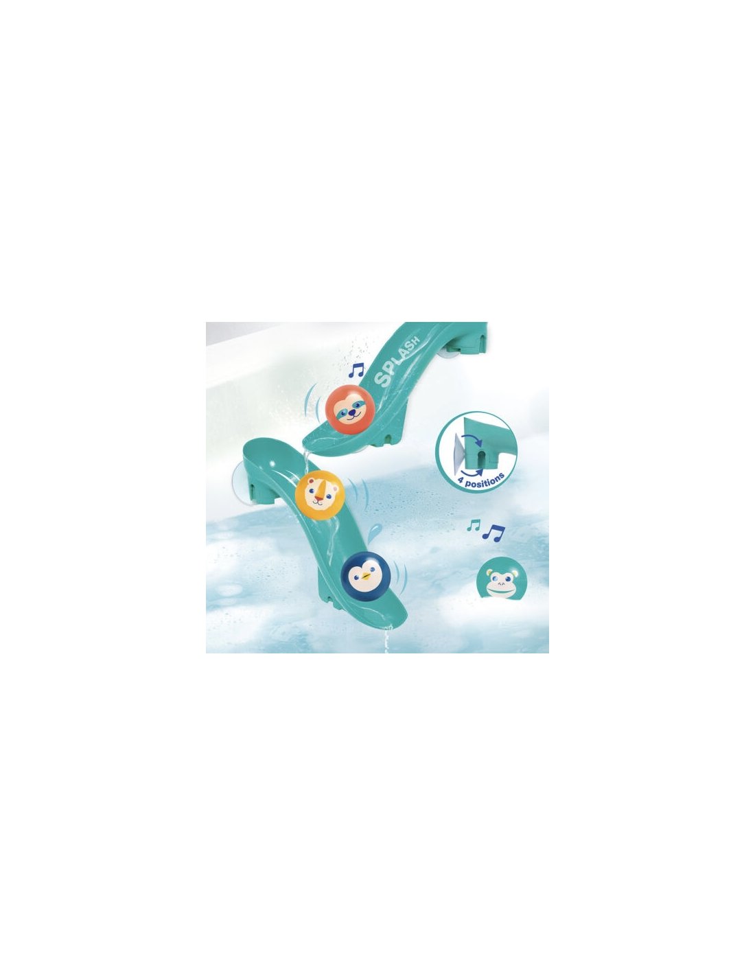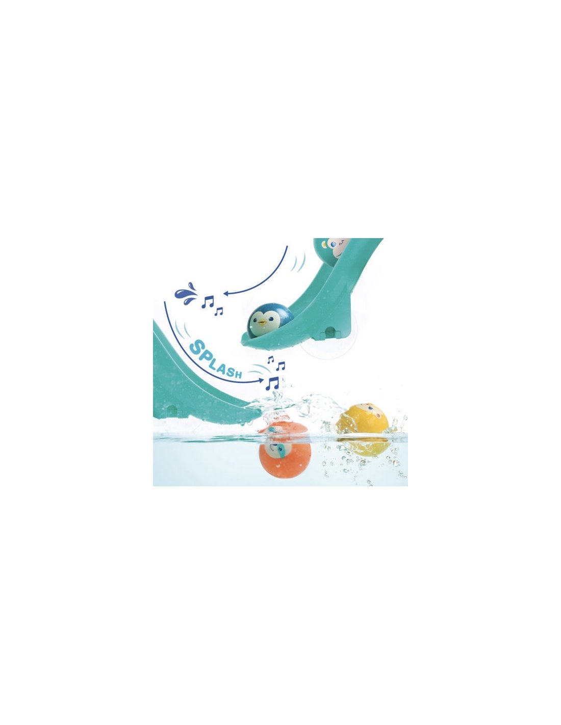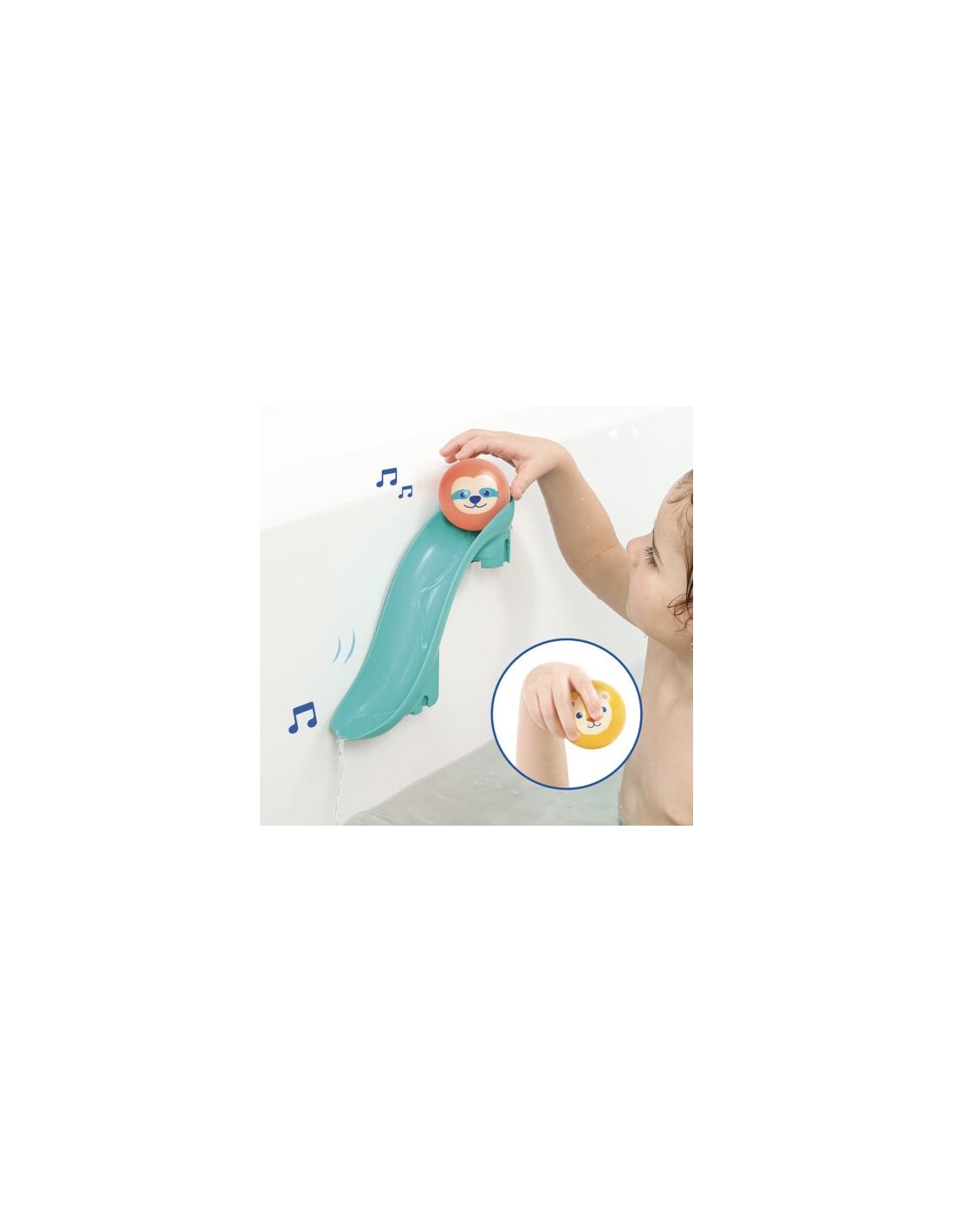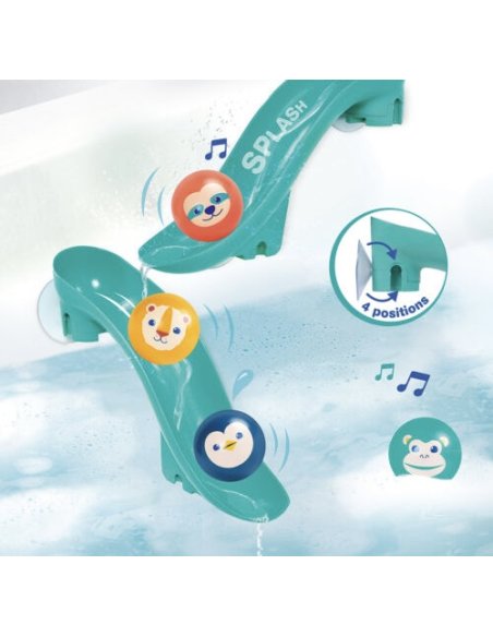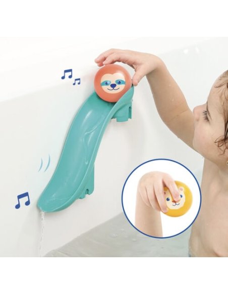 Jeu de toboggans de bain XXL modulables avec ventouses solides et balles flottantes sonores, pour créer un parcours aquatique évolutif stimulant la motricité, la coordination et l’observation dès 10 mois.